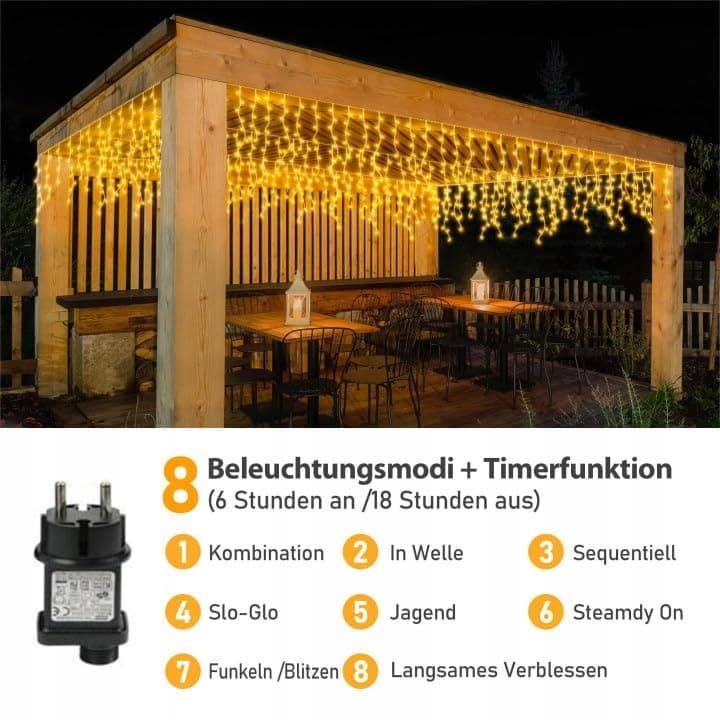 [8 trybów]: Oświetlenie świąteczne na zewnątrz ma 8 trybów oświetlenia (kombinacja, w falach, sekwencyjnie, wolno świecące, pościg, wolne znikanie, migotanie, stałe włączone). Wystarczy nacisnąć przycisk na wtyczce, aby zmienić tryby oświetlenia, aby spełnić różne potrzeby, zabierając Cię w osiem różnych, błyszczących światów.