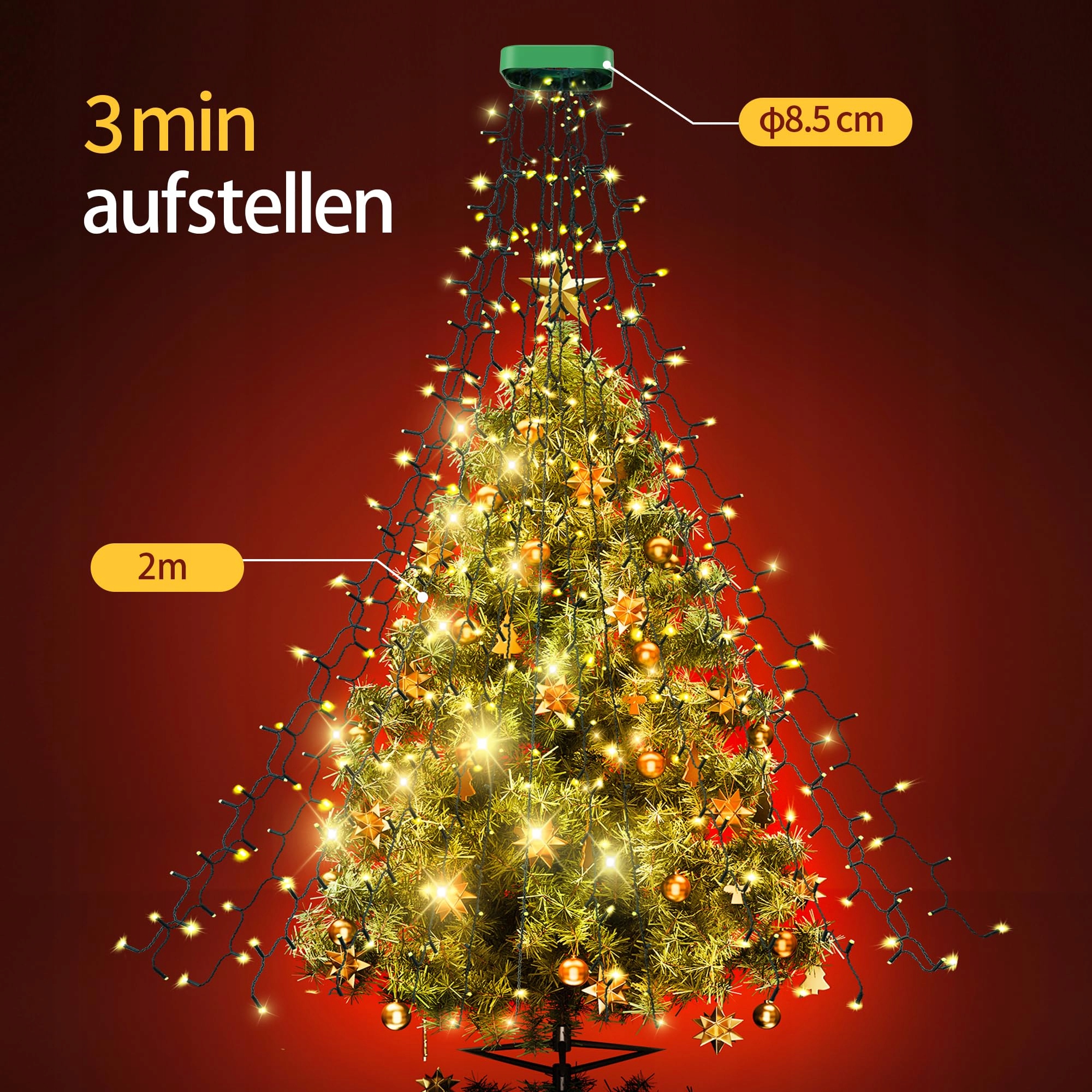 [Łańcuch świetlny na choinkę]: 16 sznurków * 2M 400 LED oświetlenie świąteczne; Średnica: 8,5 cm; Kabel zasilający: 5 m; W nocy ciemnozielona linia świetlna i choinka są zintegrowane, jakby sama choinka lśniła i przenosiła Cię w ciepłą i romantyczną noc!