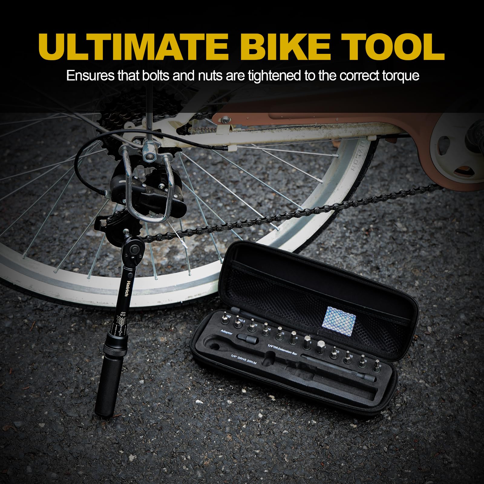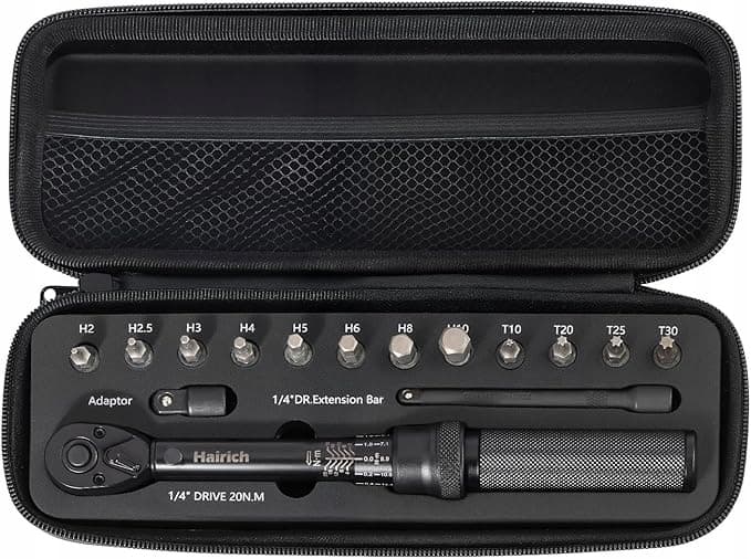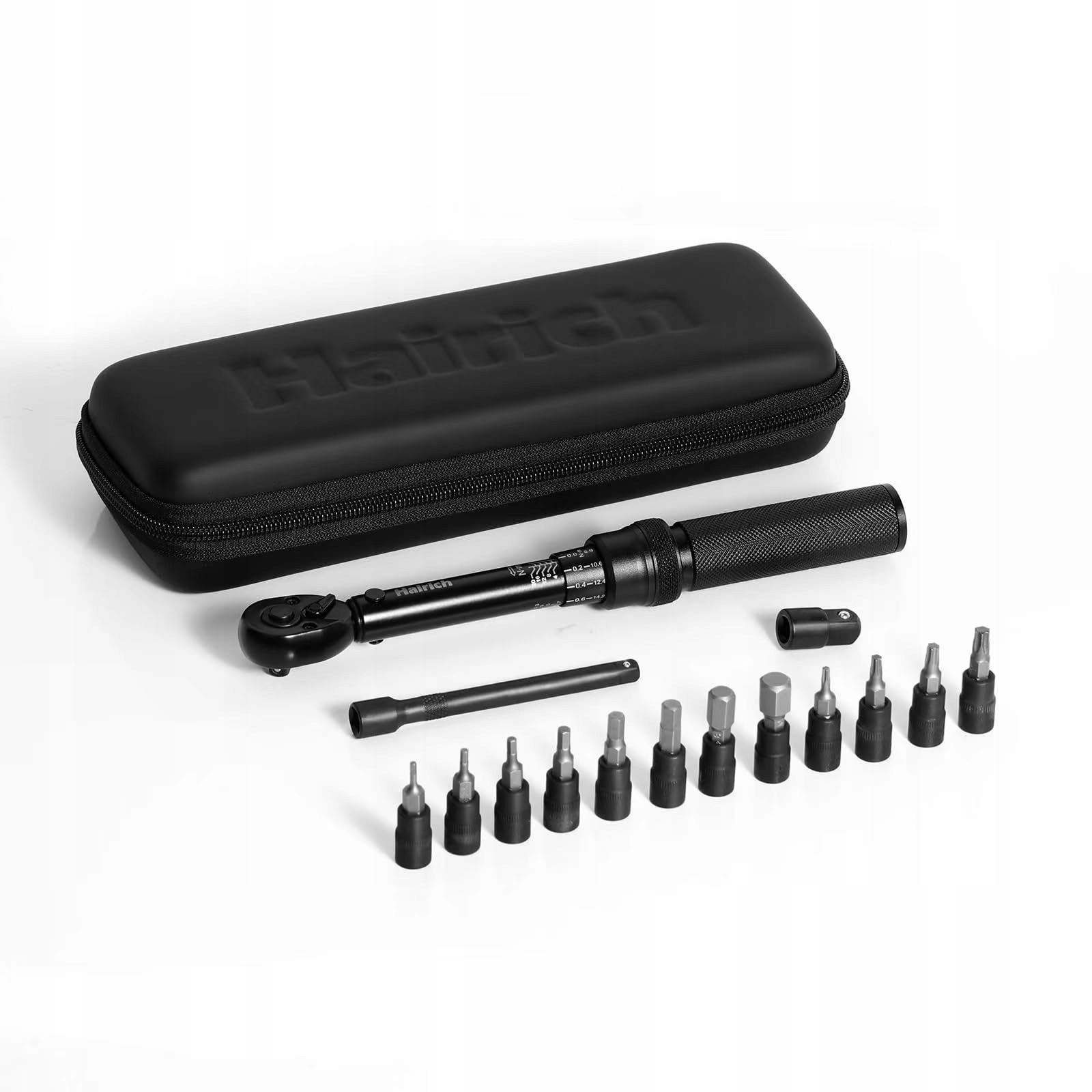 Ultimate narzędzie rowerowe – Klucz dynamometryczny Hairich do rowerów jest dostępny jako 15-elementowy zestaw i ma precyzyjną skalę od 2 do 26 niutonometrów (17,7 do 232 funtów-cali) z mikroustawieniami do 0,2 Nm. Zawiera nasadki bitowe: HEX - H2, H2.5, H3, H4, H5, H6, H8, H10 oraz TORX - T10, T20, T25, T30. W zestawie znajduje się również przedłużka o długości 7,6 cm oraz adapter 1/4 cala.