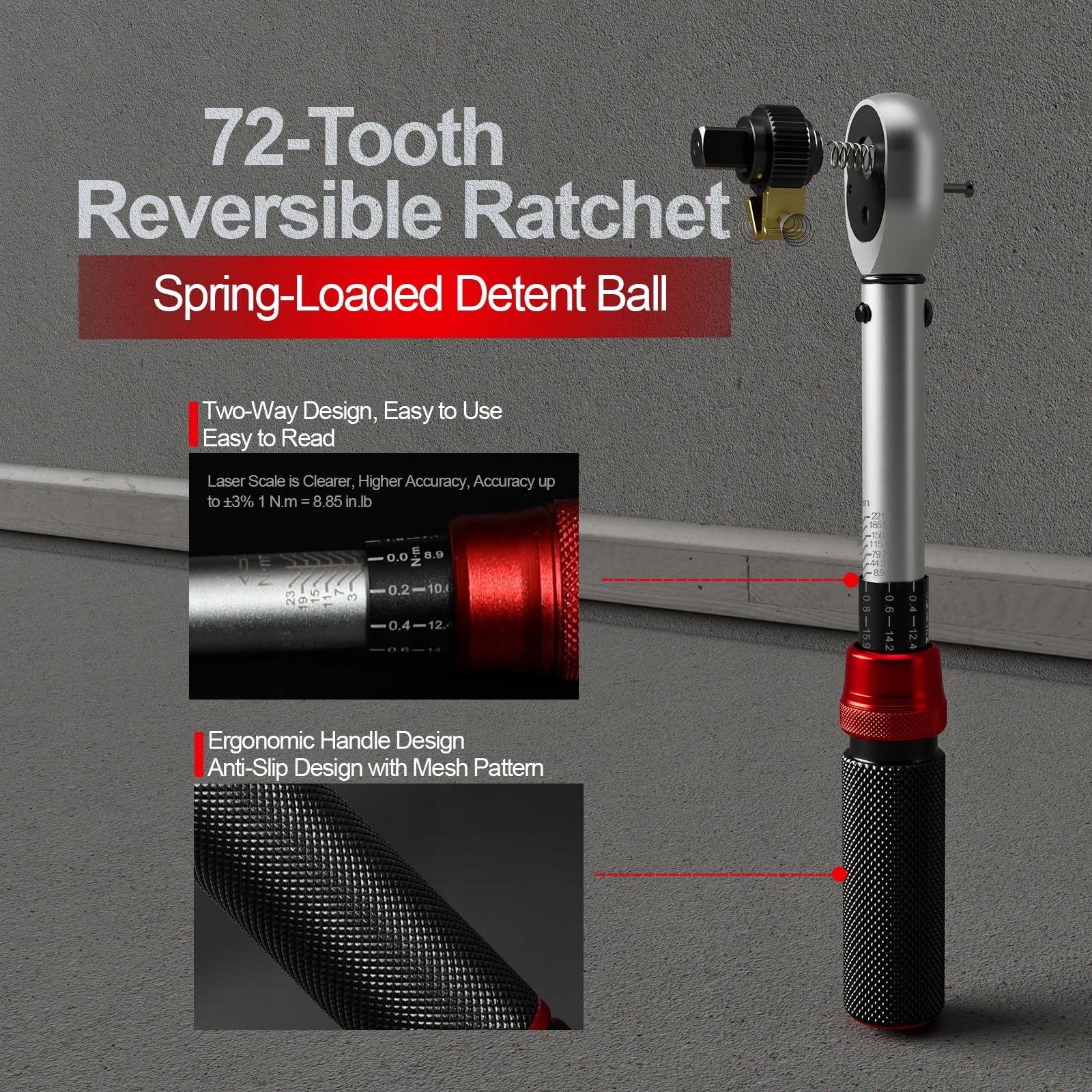 Łatwa obsługa – Klucz dynamometryczny wyposażony jest w grzechotkę z 72 zębami, którą można ustawić zarówno w prawo, jak i w lewo. Przycisk szybkiego zwolnienia umożliwia łatwą instalację i demontaż nasadek. Aby ustawić wartość momentu obrotowego, należy nacisnąć, ustawić i puścić – wartość zostanie automatycznie zablokowana. Zakres regulacji wynosi od 1 do 25 Nm, z najmniejszym krokiem 0,2 Nm.
