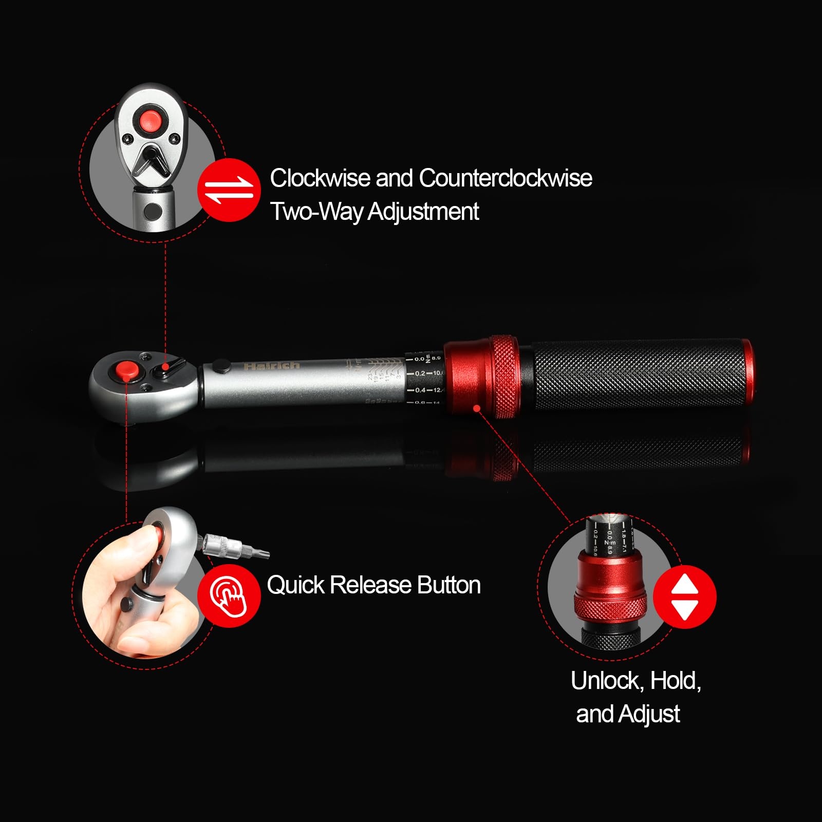 Klucz dynamometryczny Hairich do roweru 1/4 cala, 1-25Nm, 13-częściowy zestaw kluczy dynamometrycznych, 72 zęby przełączającej grzechotki, zestaw grzechotkowy w tym 10 cm przedłużka, bity sześciokątne i Torx