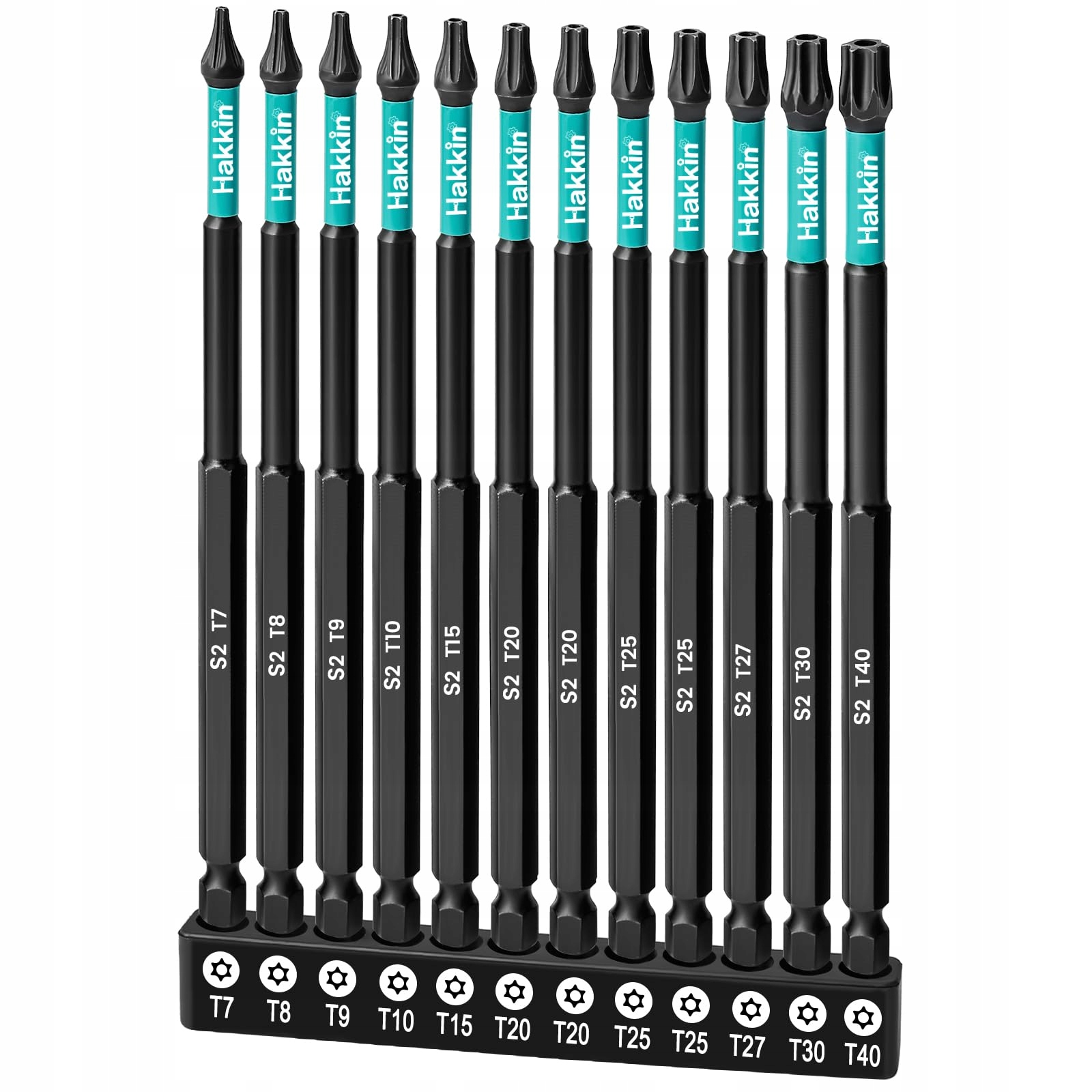 Zestaw bitów Torx Hakkin 150 mm Długi 12 sztuk Zestaw bitów do wkrętarek 1/4' S2 Torx Długie bity z otworem Zestaw długich wkrętaków Zestaw bitów Długi T7,T8,T9,T10,T15,T20,T25,T27,T30,T40