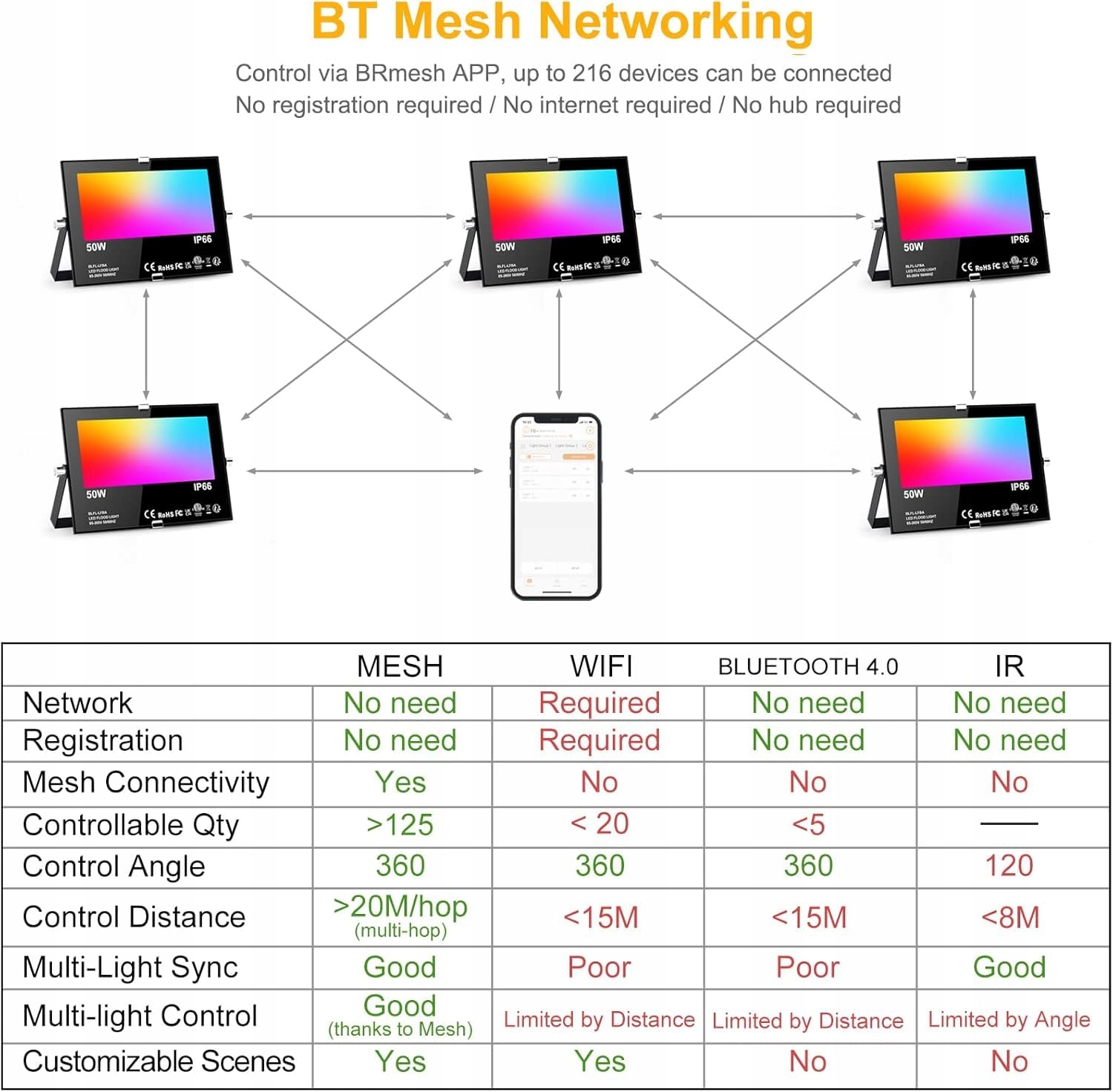 Nowa technologia i sterowanie grupowe: wyposażone w chip Bluetooth 5.0 z funkcją Mesh. Prosty i praktyczny interfejs użytkownika daje swobodę sterowania dowolną liczbą reflektorów. Doskonałe rozwiązanie do obsługi wielu świateł, które pokonuje ograniczenia świateł z pilotem i świateł WIFI. Światła mogą przekazywać sygnały między sobą, co zapewnia stabilniejsze połączenie, większą kontrolę i większy zasięg sterowania