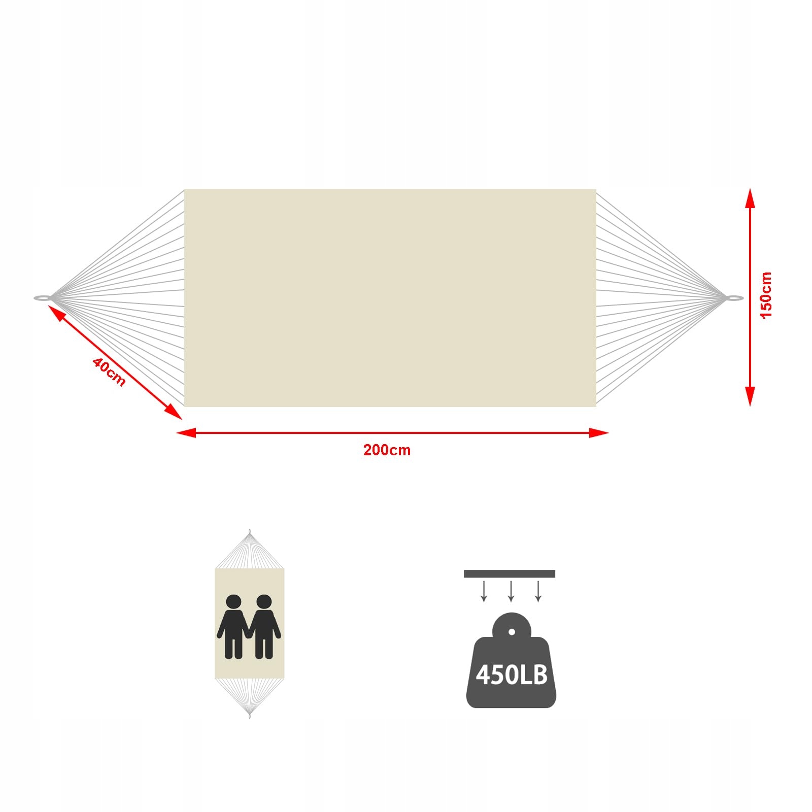 Duża makramowa hamak - Całkowita długość tego wiszącego hamaka (od pętli do pętli) wynosi 110 cali/280 cm, rozmiar łóżka to 78,8 x 59 cali/200x150 cm. Jest większy i szerszy. Może wytrzymać do 450 funtów/204 kg. Idealny do użytku dla 2 osób.