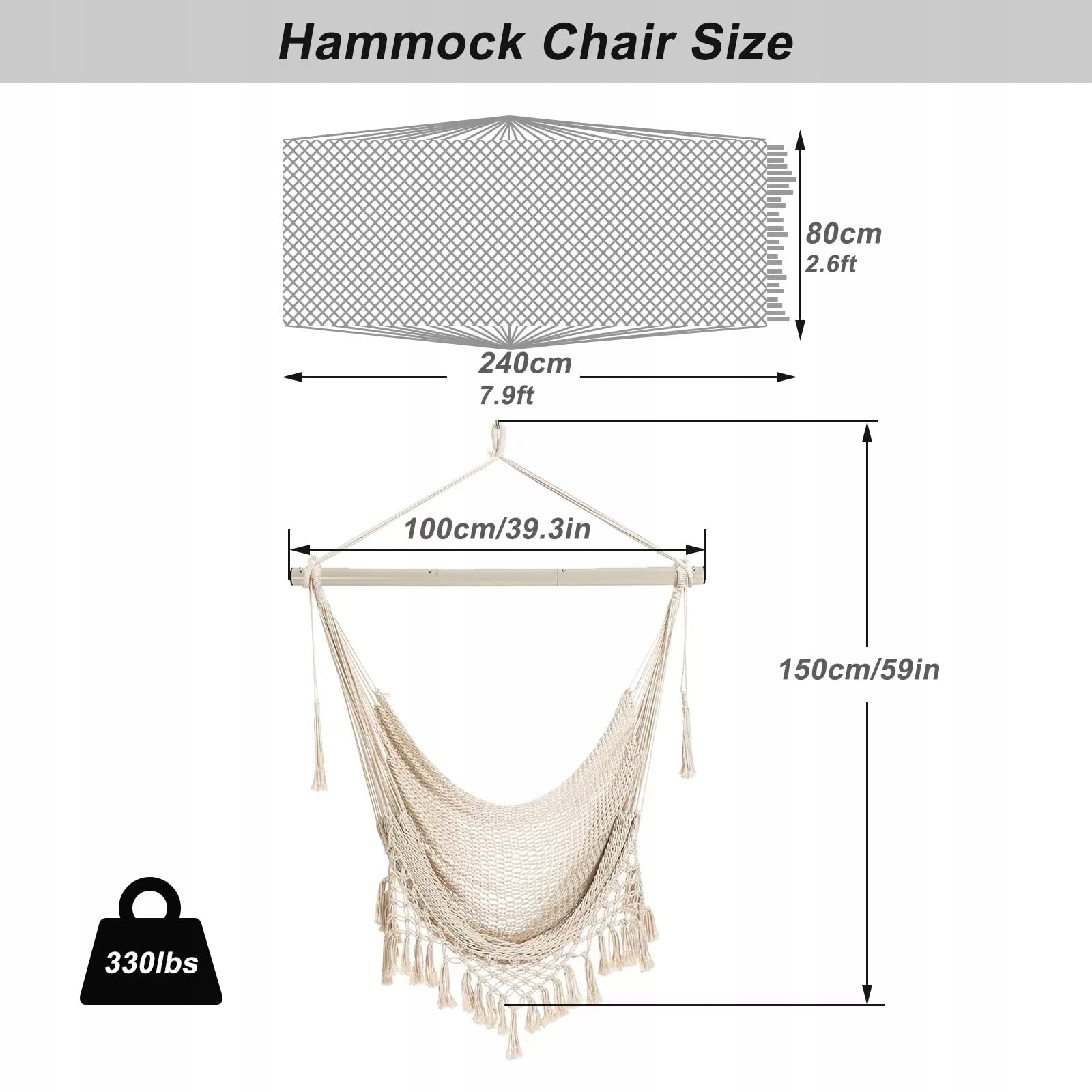 Wygodny i zrelaksowany - Fotel wiszący wykonany jest z wygodnych i trwałych bawełnianych sznurków. Szeroka rozpórka o długości 100 cm (39,37 cala) zapewnia dużo miejsca na ramiona. Jest to duży i elastyczny fotel wiszący, który pozwala na rozciągnięcie tkaniny, siedzenie w nim i całkowite wyprostowanie nóg lub prawie płaskie położenie się. Jest również wystarczająco mocny, aby wytrzymać obciążenie do 150 kg.