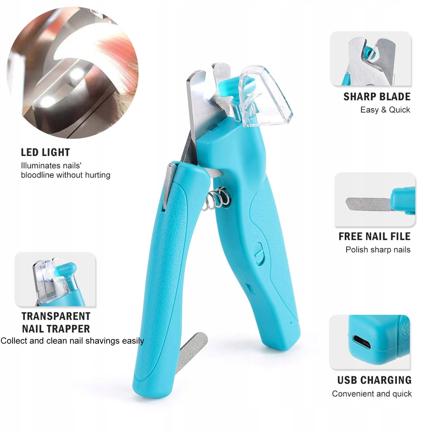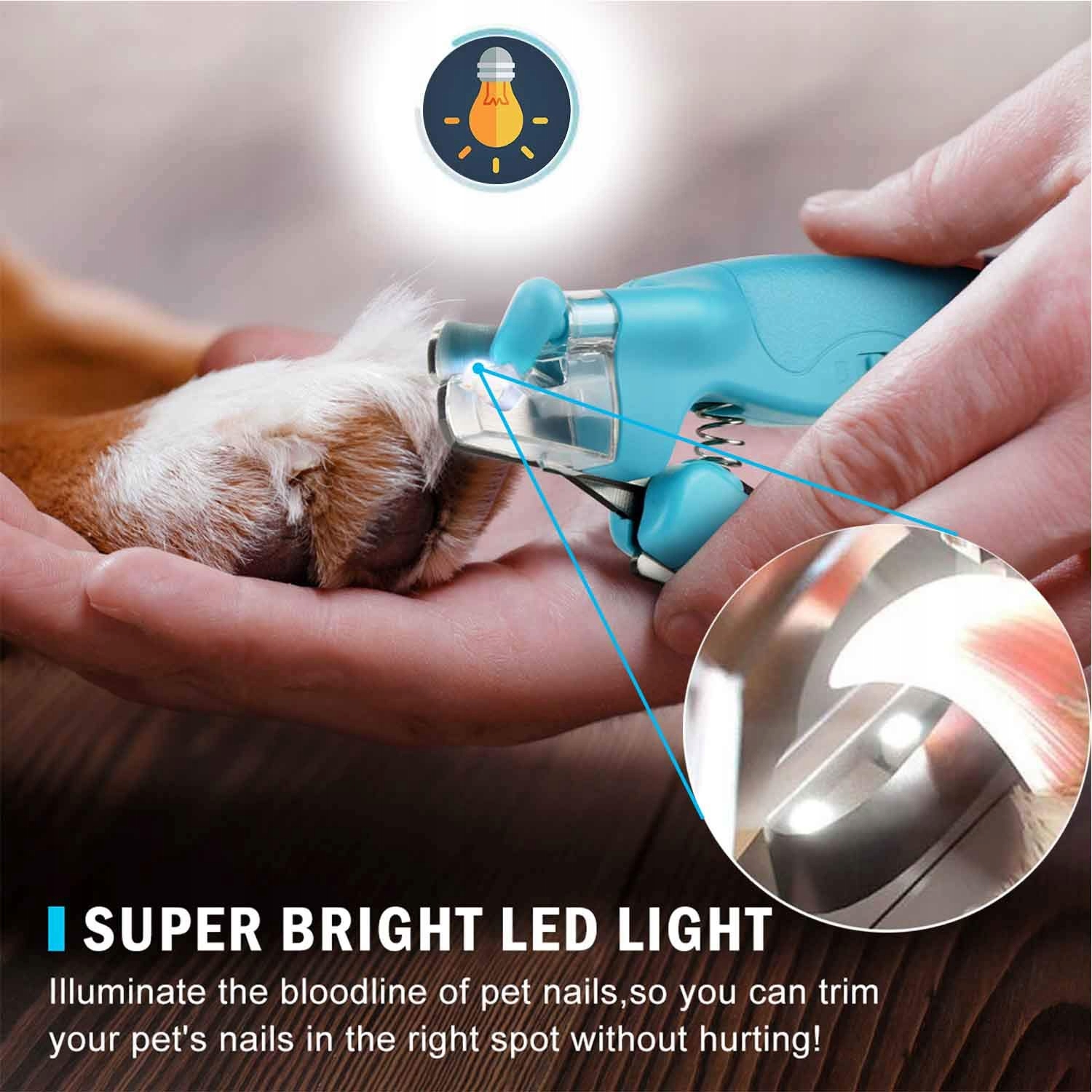 [Superjasne światło LED i łapacz paznokci] – oświetla linię krwi jasnych paznokci, dzięki czemu możesz obciąć paznokcie swojego zwierzaka we właściwym miejscu, nie raniąc go. Przezroczysty łapacz paznokci pomaga złapać odcięte paznokcie, co ułatwia czyszczenie i zapobiega ich rozrzucaniu.