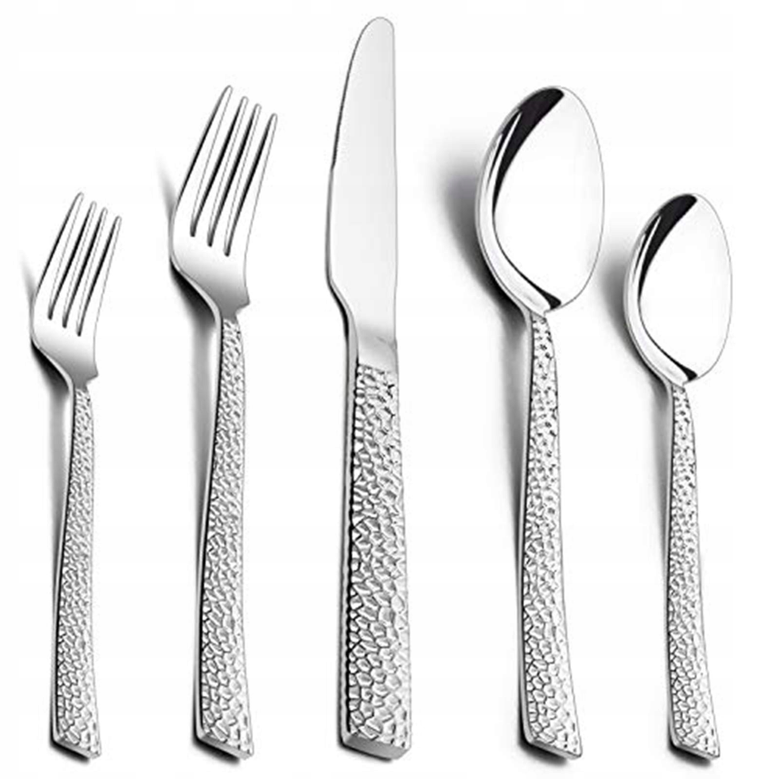 【Nowoczesny i elegancki design】Nowoczesny design z kwadratowym uchwytem młotkowym łączy elegancki wygląd, idealnie pasuje do Twojej istniejącej zastawy stołowej, aby poprawić Twoje doświadczenia kulinarne. Ergonomiczny kształt uchwytu połączony z odpowiednią wagą i grubością zapewnia wygodny chwyt i dobrą równowagę w dłoni
