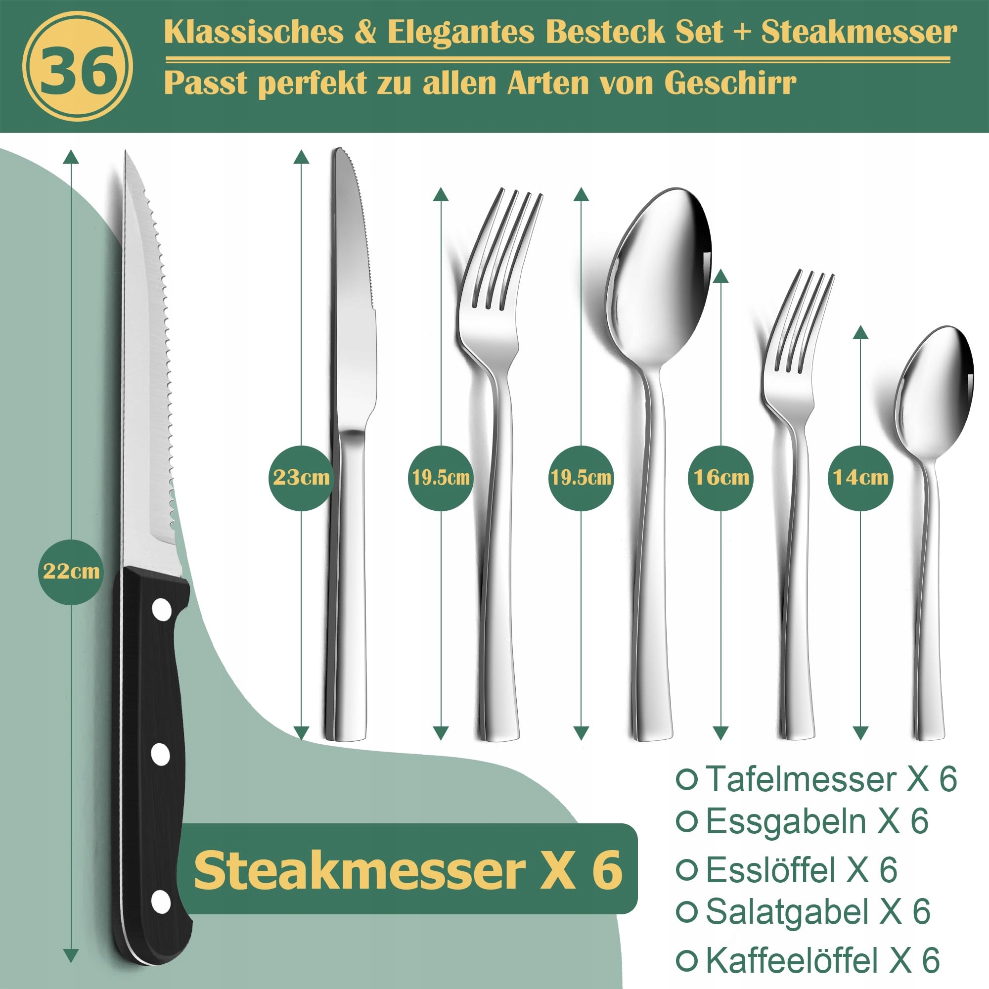 【Zestaw sztućców dla 6 osób】 - HaWare 36-elementowy zestaw sztućców z nożem do steków składa się z 6 noży, 6 widelców, 6 łyżek, 6 widelczyków do sałatek, 6 łyżeczek i 6 noży do steków, Ten elegancki zestaw sztućców nadaje się do codziennego jedzenia oraz różnych formalnych okazji, takich jak rodzinne uroczystości, bankiety, wesela i przyjęcia itp.