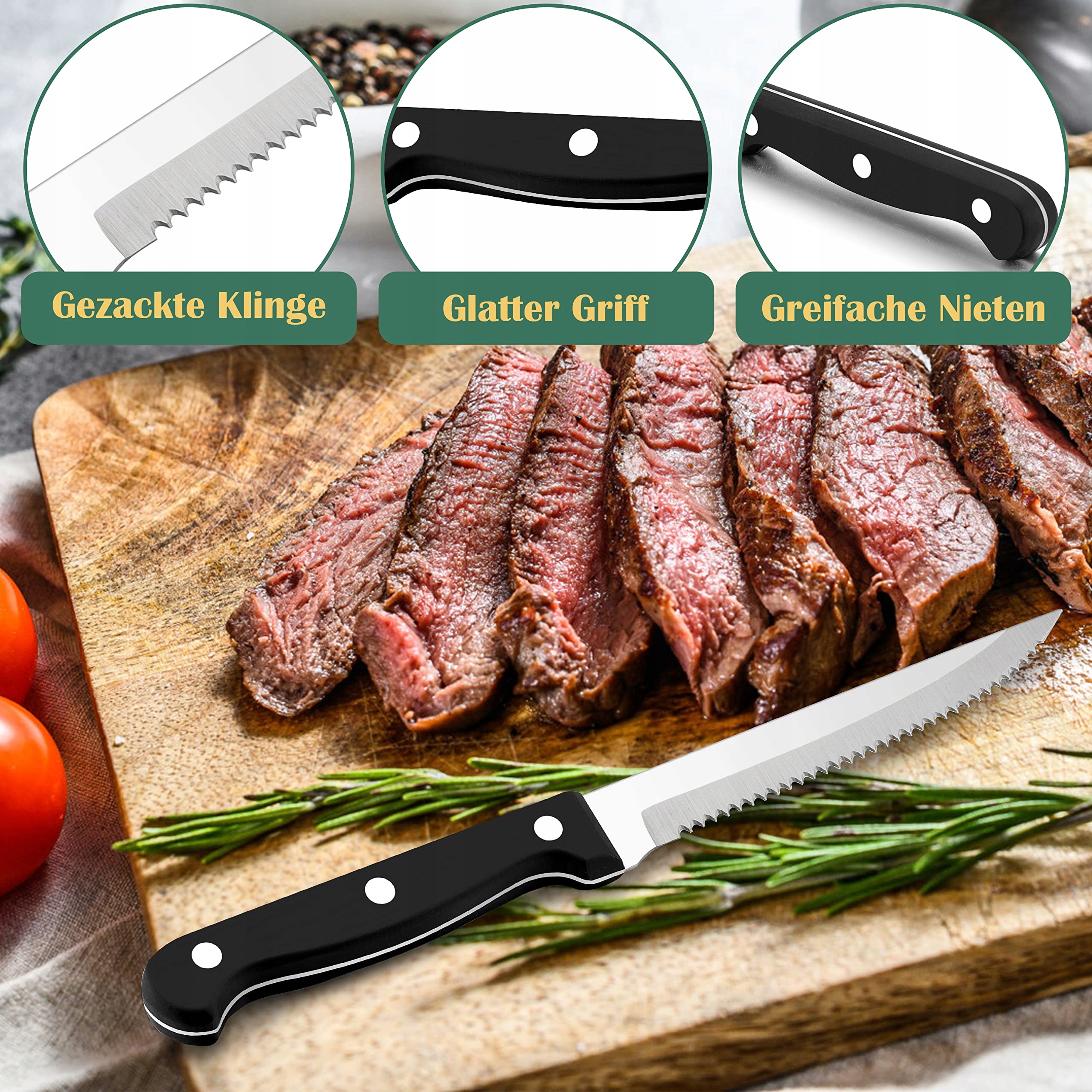 【Zestaw noży do steków】 - Zawiera 6 sztuk wysokiej jakości noży do steków z jednoczęściowym ostrzem i potrójnie nitowanym designem, które nie łatwo się rozdzielają, Ostro zakończone ostrza z mikroząbkowaniem, idealne do krojenia steków i różnych twardych potraw, Doskonałe do użytku w domu, w hotelu i w restauracji