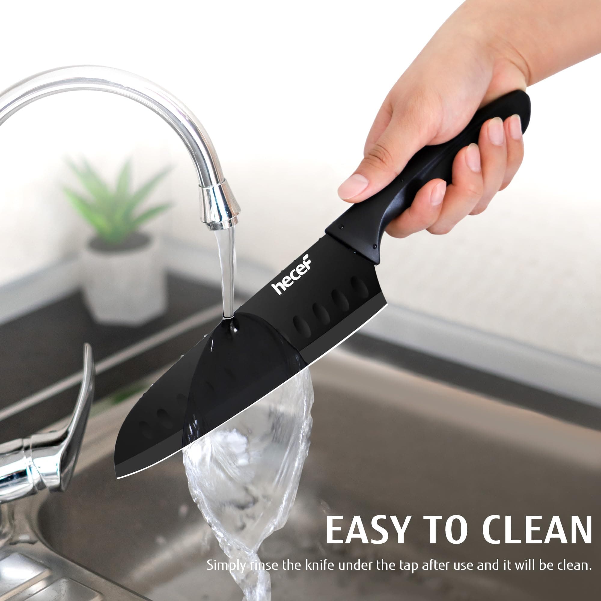 hecef Zestaw noży czarny, zestaw noży kuchennych z powłoką nieprzywierającą, ergonomiczny uchwyt, nadający się do mycia w zmywarce, ostry zestaw noży kuchennych z osłoną na noże dla początkujących i miłośników gotowania (3-częściowy)