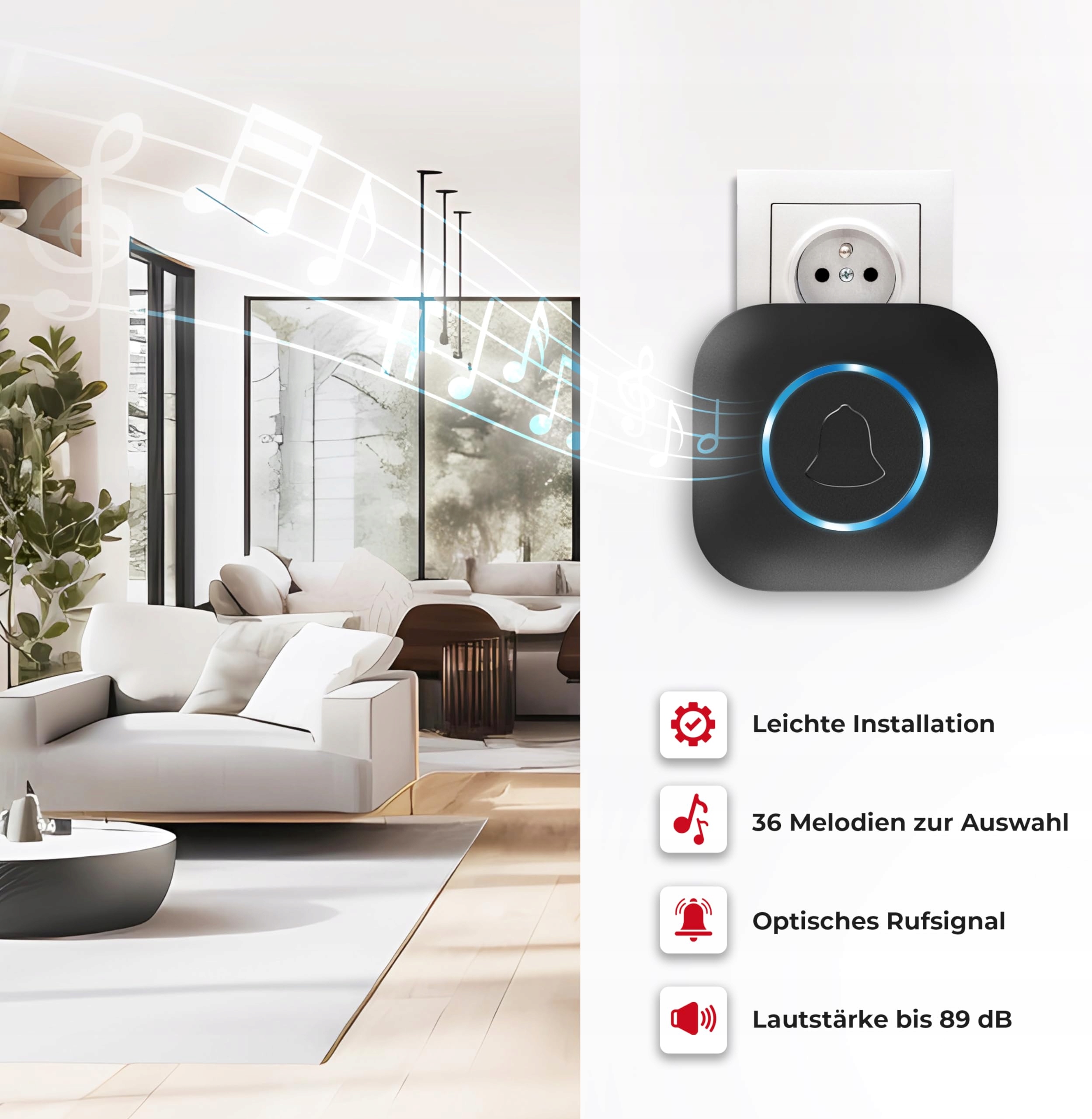 BARDZO ŁATWA INSTALACJA: Dzwonek bezprzewodowy wystarczy podłączyć do gniazdka i nacisnąć nadajnik – Twój dzwonek Blackline jest gotowy i skonfigurowany!