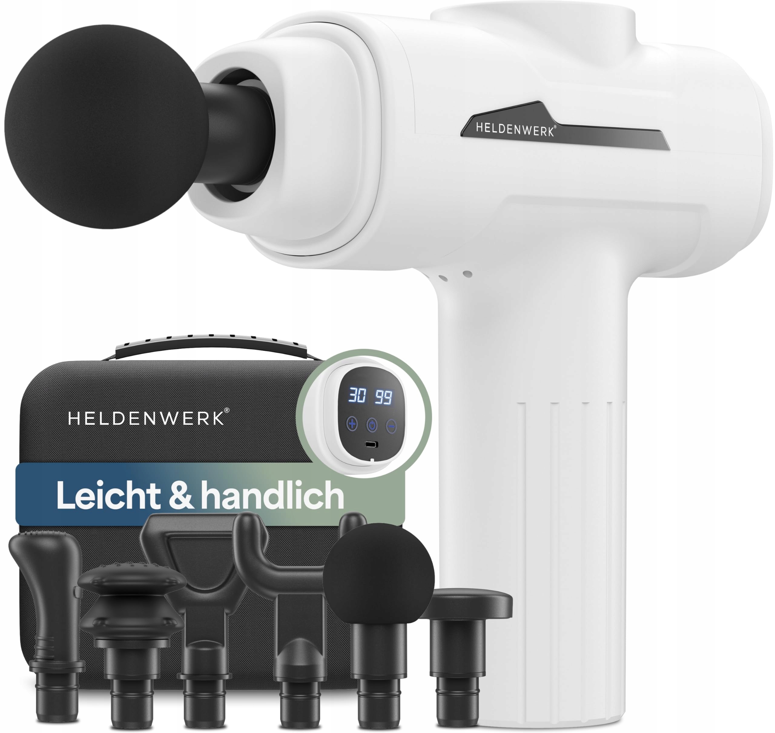HELDENWERK Pistolet Do Masażu 6 Główki 30 Prędkości USB-C LCD Biały