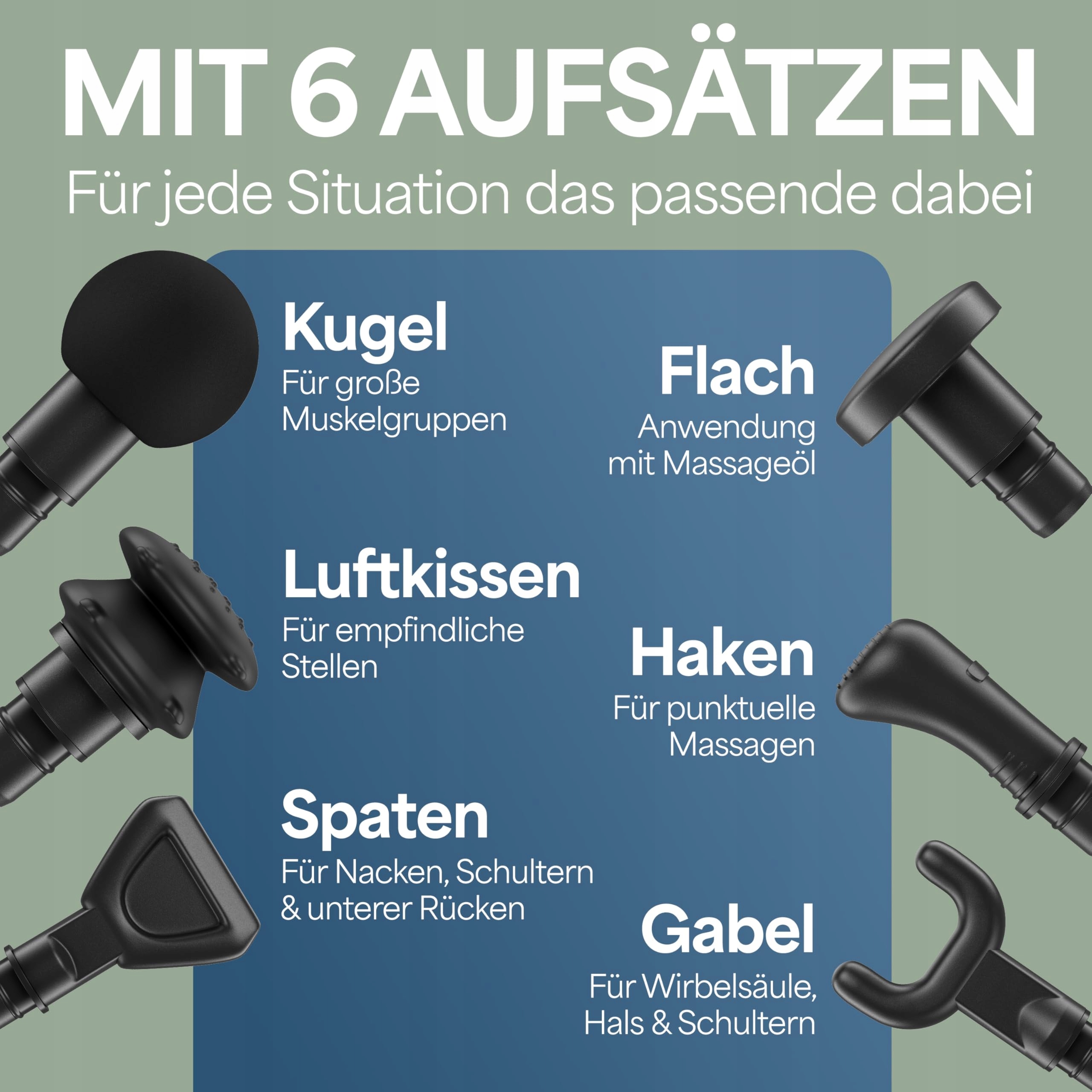 UNIKALNY - Specjalnie zaprojektowana głowica powietrzna do szczególnie wrażliwych miejsc na ciele oraz głowica do aplikacji olejowych sprawiają, że pistolet do masażu powięzi jest wyjątkowy. W sumie dołączono 6 końcówek masujących.