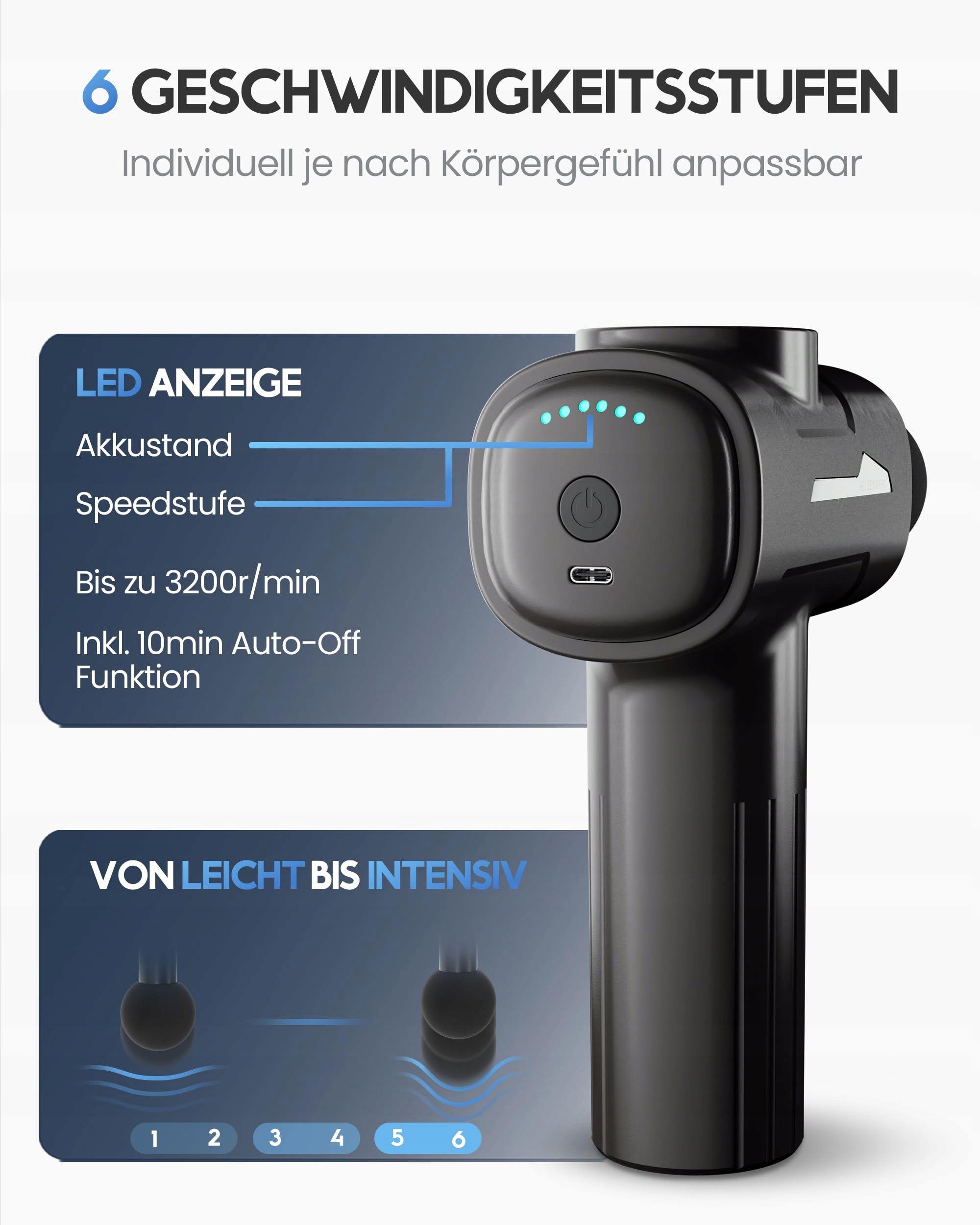 [SPORTOWE ODPRĘŻENIE] - Odkryj swój nowy pistolet do masażu z 6 końcówkami w zestawie, w tym torbą do przechowywania. Idealny do intensywnego masażu mięśni po treningu. Zaledwie dziesięć minut dziennie wyraźnie poprawia samopoczucie i napięcia to już przeszłość!