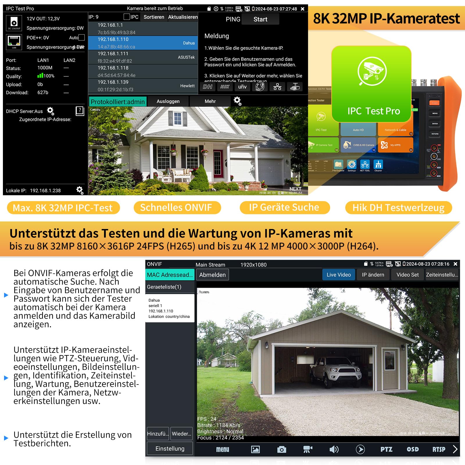 【Tester kamer IP】 Tester kamer sieciowych obsługuje maksymalnie 8K 32MP 8160×3616P 24FPS, test kamer IP 4K 12MP 4000×3000P. Wykrywanie ruchu sieciowego w czasie rzeczywistym na pasku stanu. Rapid Video, automatyczne wyświetlanie wideo, tworzenie raportu testowego. Wykrywanie IP/ONVIF/test IPC/odtwarzanie RTSP/aplikacja klienta. Tester CCTV z wbudowanymi specjalistycznymi narzędziami HIK i DH oraz aplikacją do testów ONVIF, obsługuje szybkie ustawienia dla kamer Hikvision i Dahua oraz jest kompatybilny z większością istniejących kamer IP.