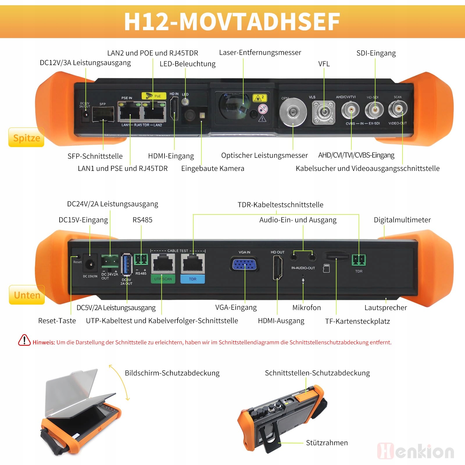 Henkion IPC-H12-MOVTADHSEF tester kamer CCTV z 8-calowym monitorem dotykowym IPS Tester CCTV obsługuje test IPC 8K oraz testy kamer 4K TVI CVI AHD SDI SFP DMM OPM TDR POE HDMI VGA WiFi RS485