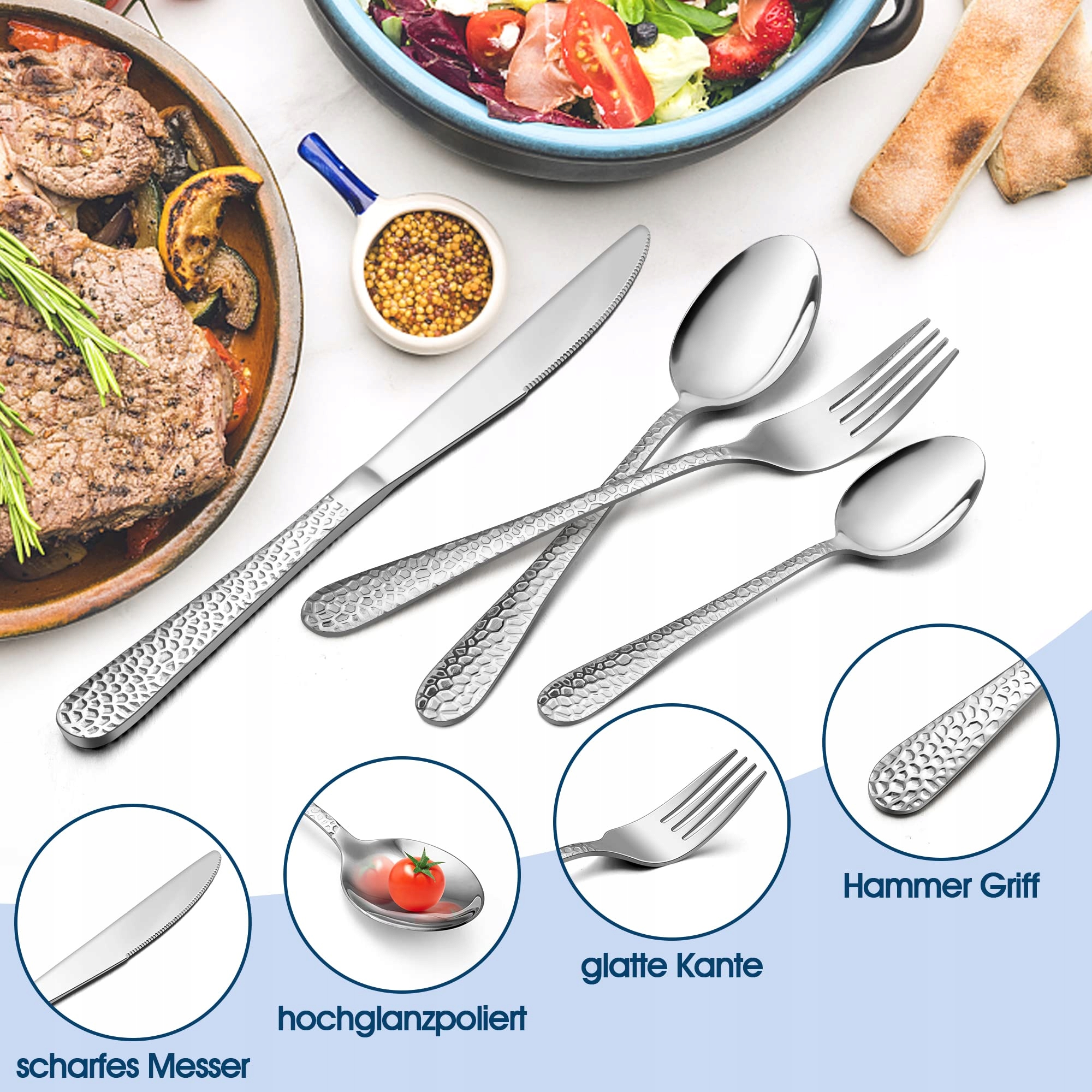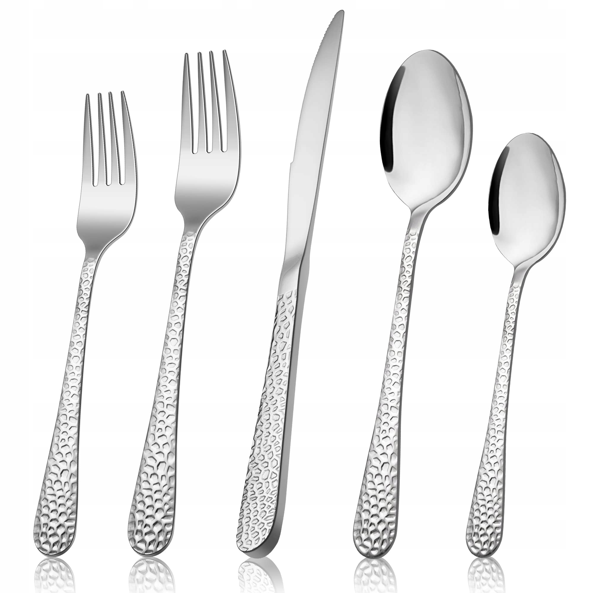 【Wykwintne wykonanie】Lustrzanie polerowana, błyszcząca powierzchnia poprawia wygląd Twojej dekoracji stołu. Młotkowany uchwyt czyni Twoje sztućce wyjątkowymi. Zestaw sztućców jest nowoczesny i elegancki oraz zapewnia przyjemną kolację