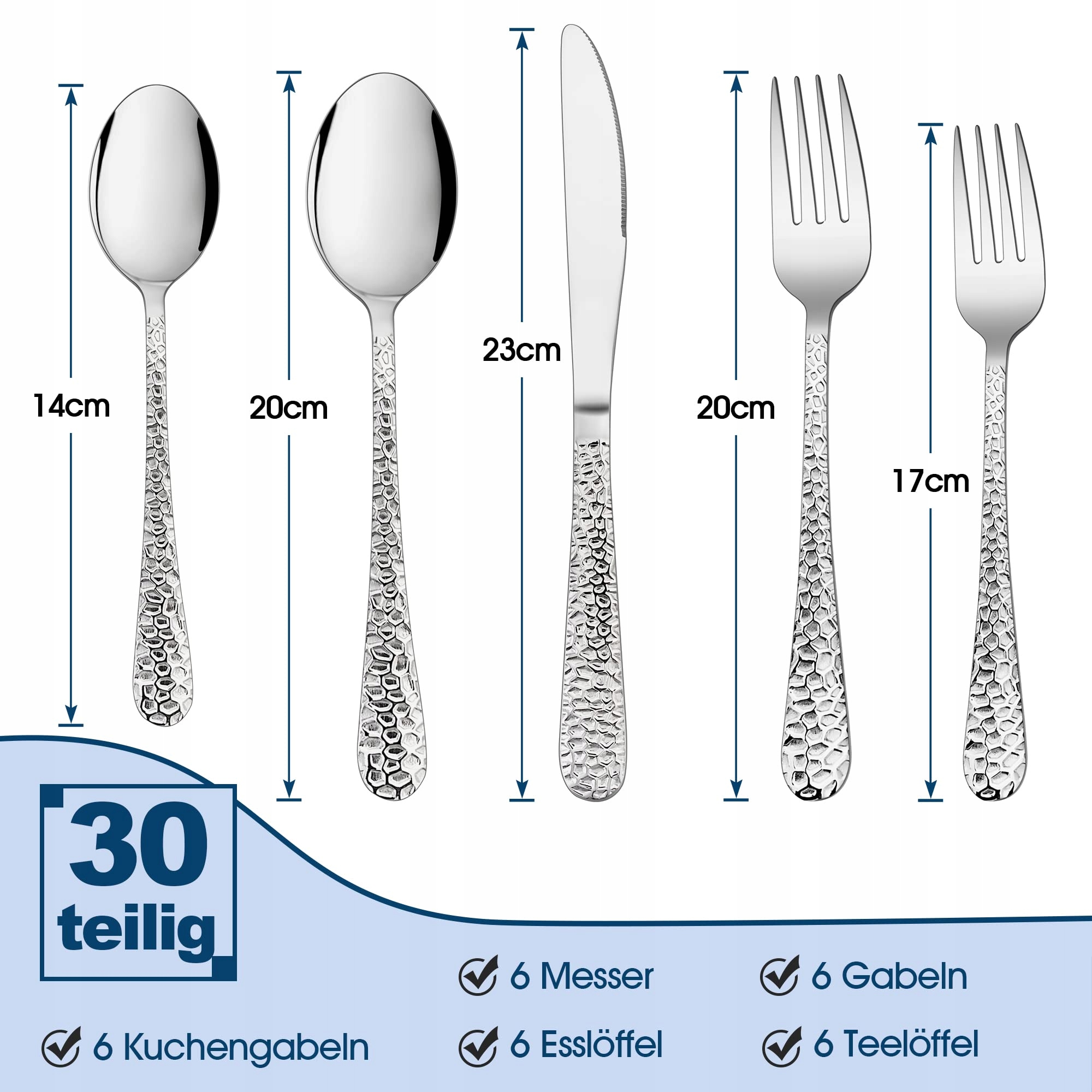 Zestaw sztućców Herogo, 30-częściowy zestaw sztućców ze stali nierdzewnej dla 6 osób, eleganckie sztućce ze srebrnym młotkowanym uchwytem, sztućce do jedzenia z nożem, widelcem, łyżką, nadające się do zmywarki/antykorozyjne/polerowane