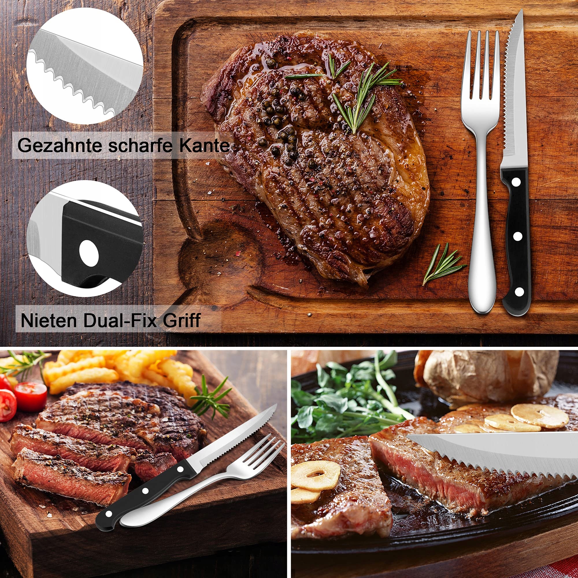 【Zestaw noży do steków】Zawiera 6 noży do steków, wysokiej jakości nóż do steków ze stali z ząbkowanym ostrzem i łatwo krojącym mięso, trzy nitowane nity ze stali nierdzewnej podwójnie mocujące antypoślizgowe uchwyty POM, trwałe i niełatwe do poluzowania