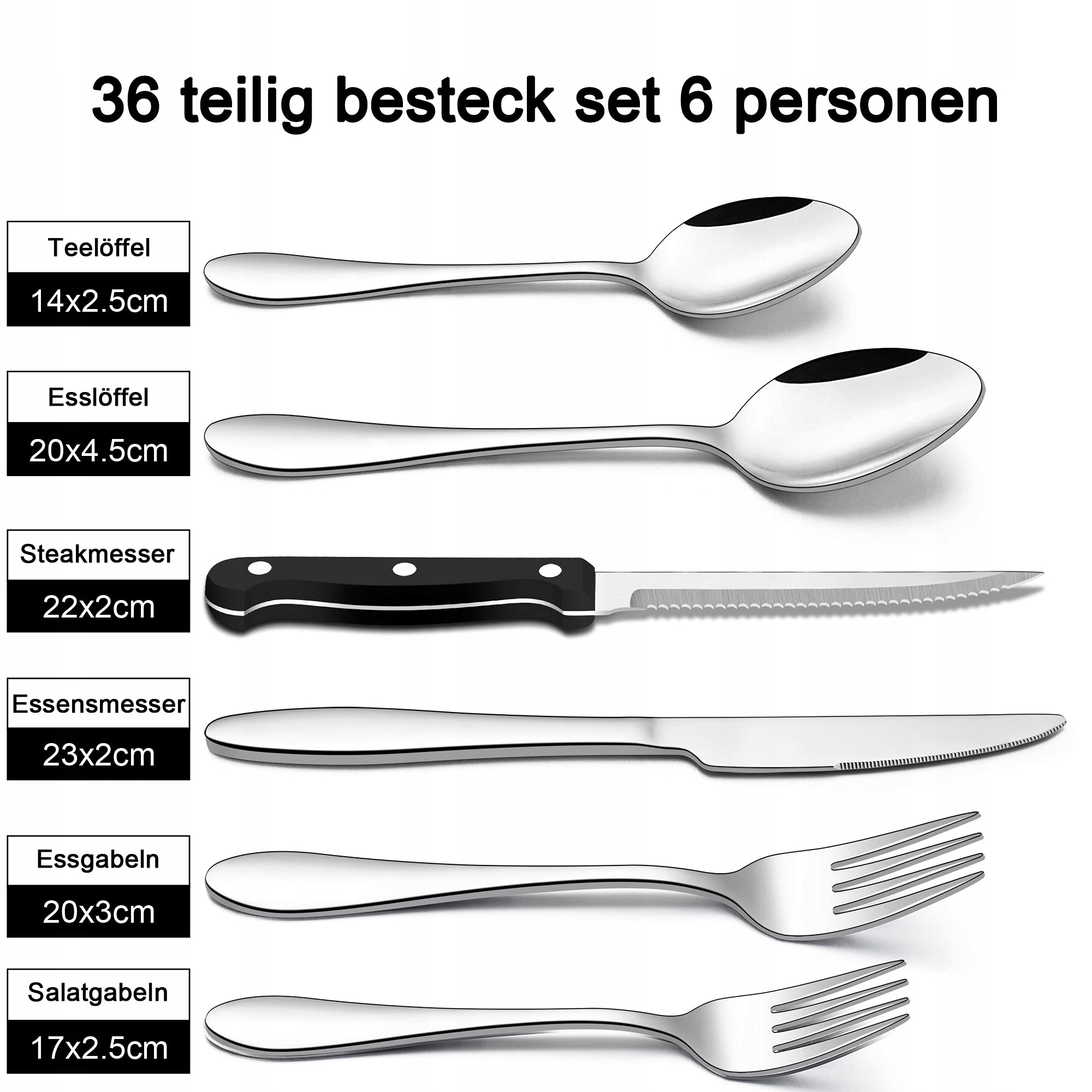 【Zestaw sztućców dla 6 osób】36-częściowy zestaw sztućców ze stali nierdzewnej składający się z 6 widelców do jedzenia, 6 noży do jedzenia, 6 łyżek do jedzenia, 6 łyżeczek, 6 widelczyków do sałatek oraz 6 noży do steków, metalowe sztućce o wysokim połysku, eleganckie srebro stołowe jako idealny prezent na Boże Narodzenie, urodziny, parapetówkę itp.