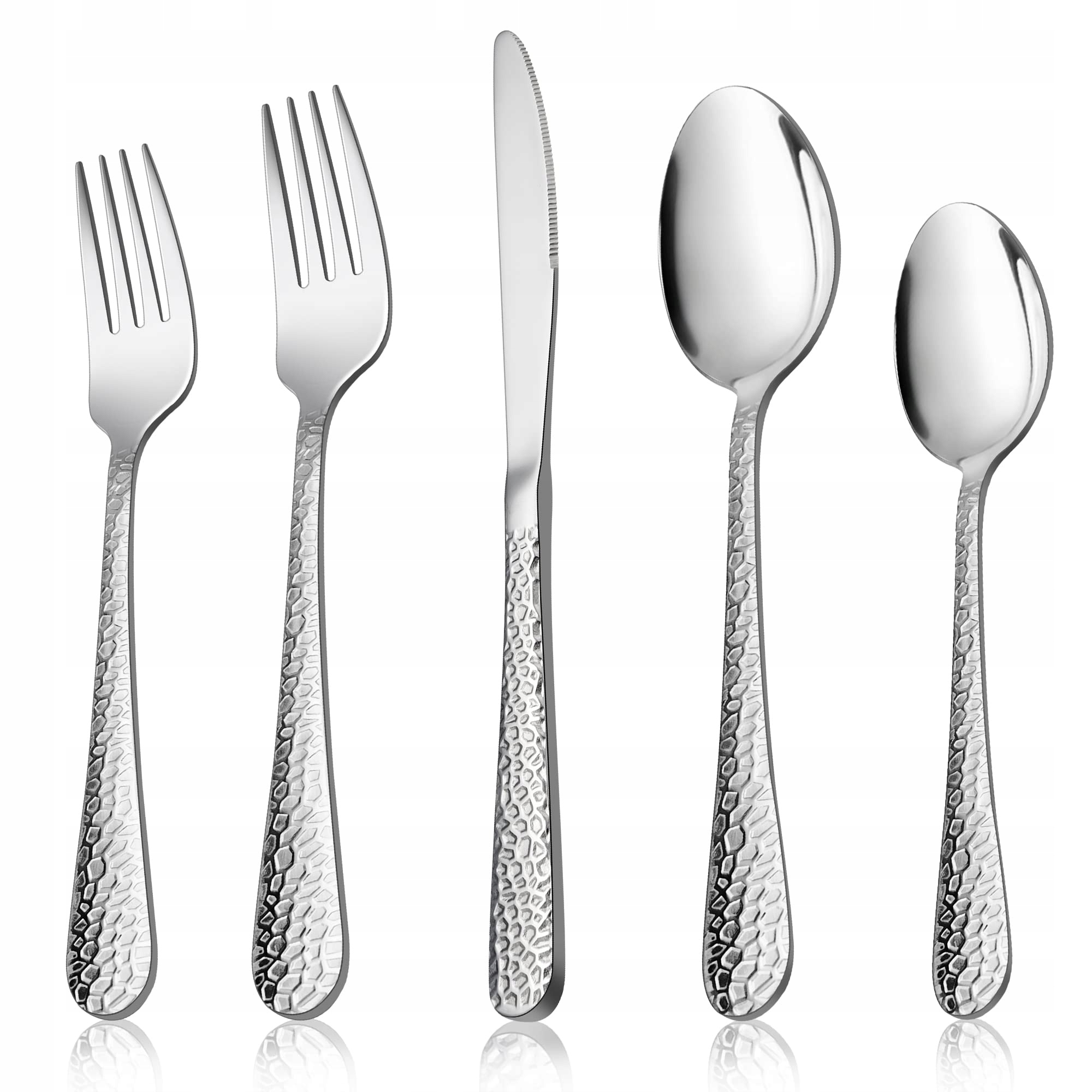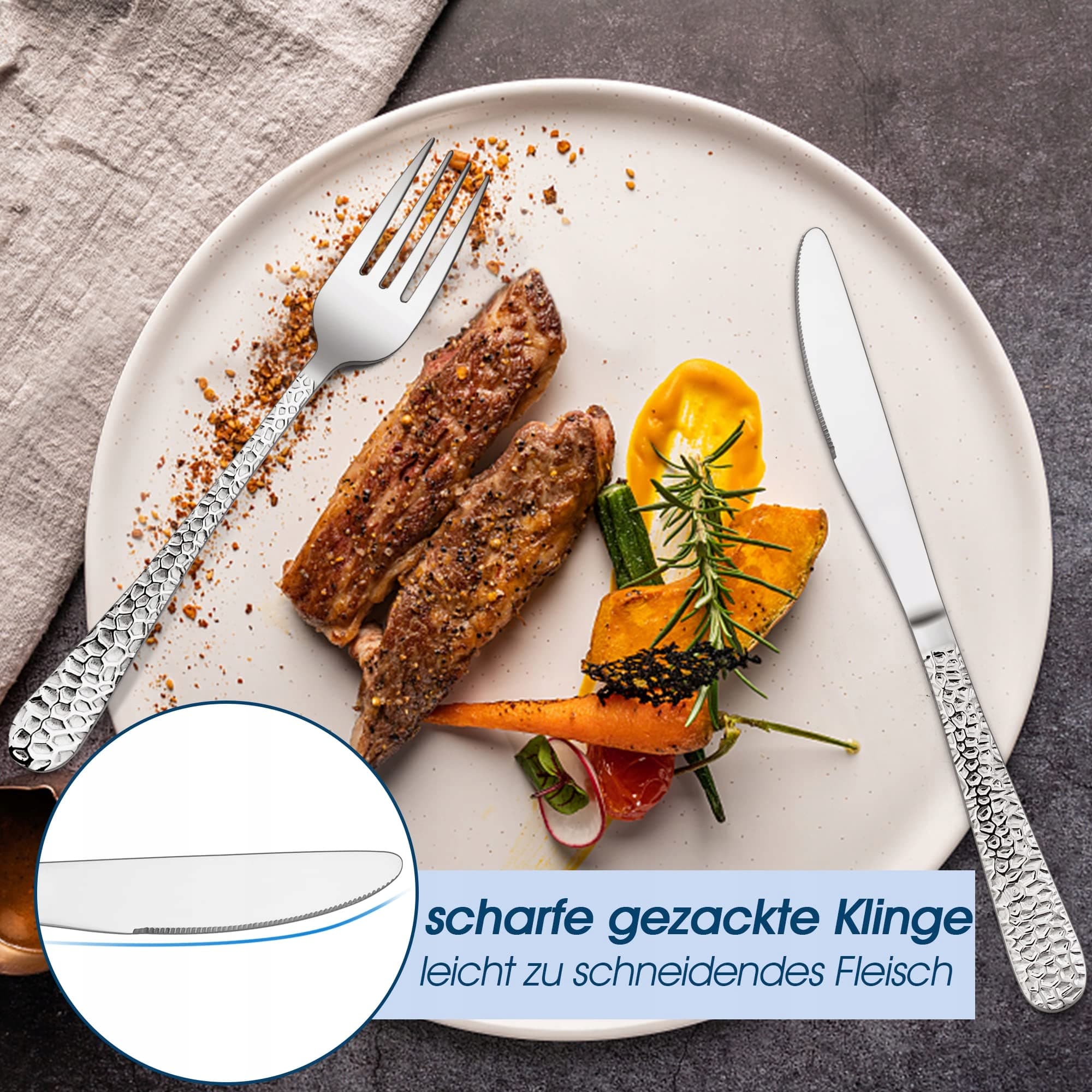 【Wyjątkowe wykonanie】Lustrzanie polerowana, błyszcząca powierzchnia poprawia estetykę dekoracji stołu. Młotkowany uchwyt sprawia, że Twoje sztućce są wyjątkowe. Zestaw sztućców jest nowoczesny i elegancki, zapewnia przyjemną kolację