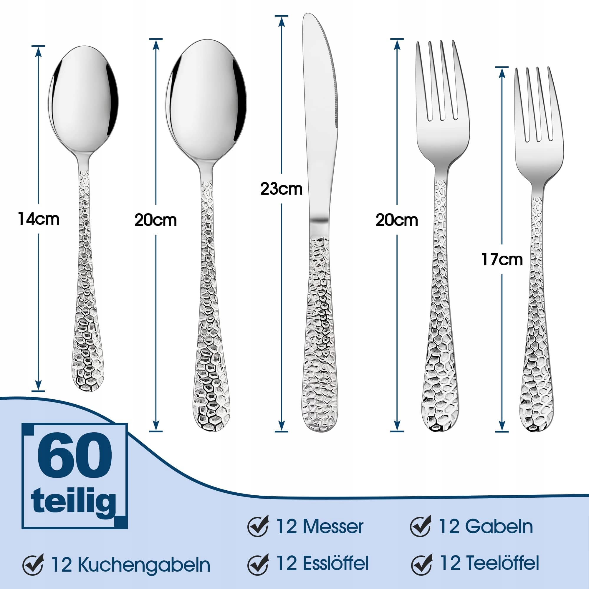Zestaw sztućców Herogo dla 12 osób, 60-częściowy zestaw sztućców ze stali nierdzewnej z nożem, widelcem, łyżką, eleganckie sztućce w srebrnym młotkowanym uchwycie do domu/imprezy/restauracji, nadające się do mycia w zmywarce, nierdzewne, polerowane