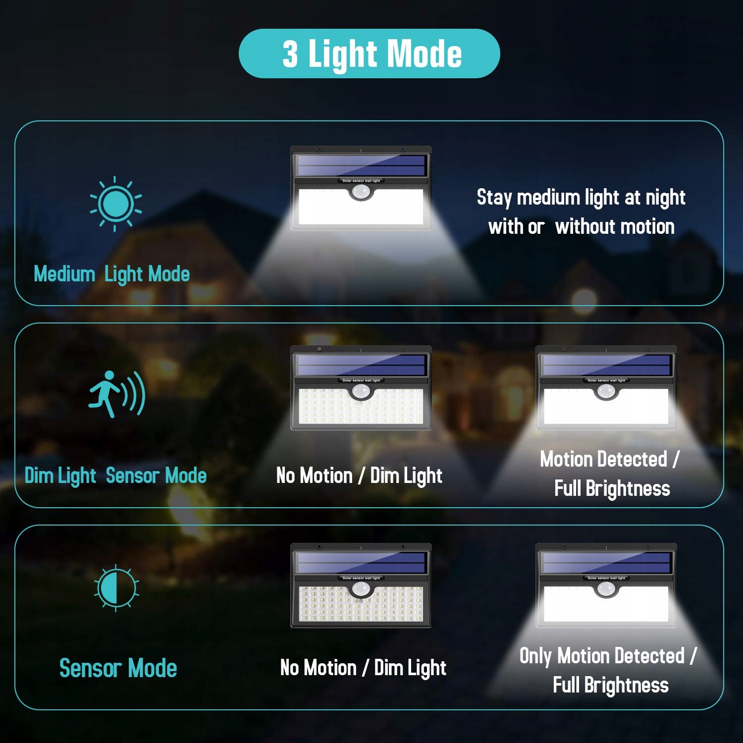 [Lampy solarne z czujnikiem ruchu i inteligentną technologią sensorową]78 lamp LED ma 3 tryby do wyboru: tryb długiego mocnego światła, tryb czujnika światła o niskiej jasności, tryb czujnika mocnego światła. Zaktualizowany czujnik ruchu PIR wykrywa osoby w odległości 10-16 stóp. Spełnia różne wymagania.