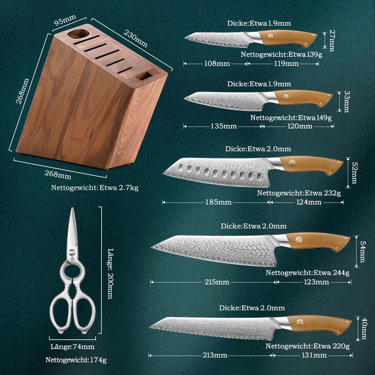 Idealny zestaw noży damasceńskich: Ten zestaw noży zawiera nóż kuchenny, nóż Santoku, nóż uniwersalny, nóż do chleba, nóż do obierania, nożyczki kuchenne ze stali nierdzewnej, diamentową ostrzałkę i uchwyt na noże z drewna. Spełnia różne potrzeby krojenia.