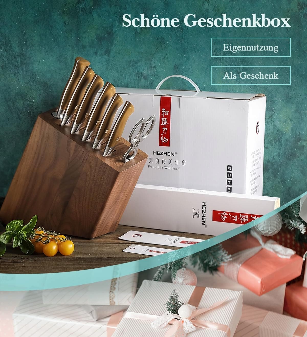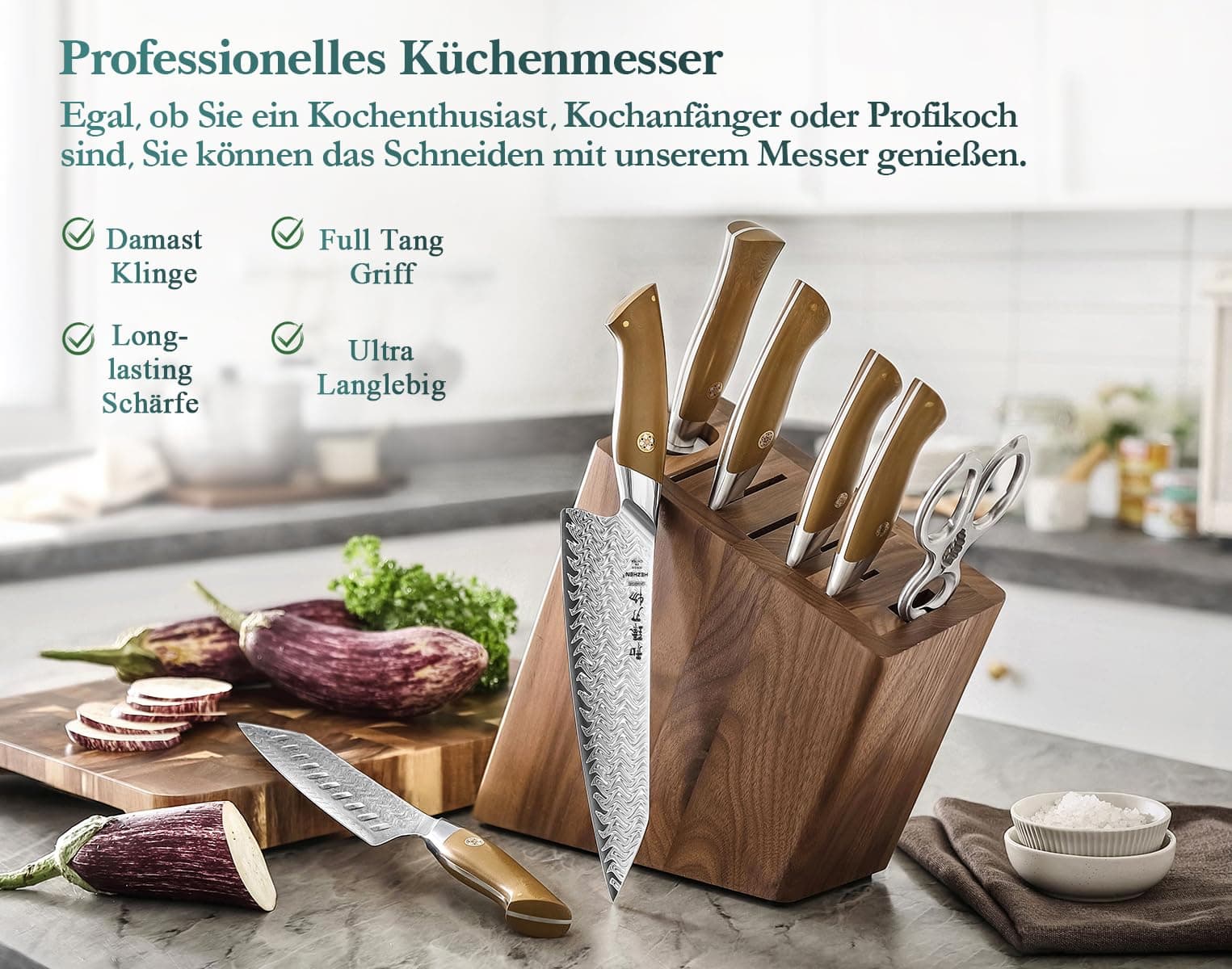 HEZHEN Zestaw noży blokowych 8-częściowy, zestaw noży kuchennych Damast, noże Santoku, nożyczki kuchenne ze stali nierdzewnej, ostrzałka z twardej stali, uchwyt na noże z drewna