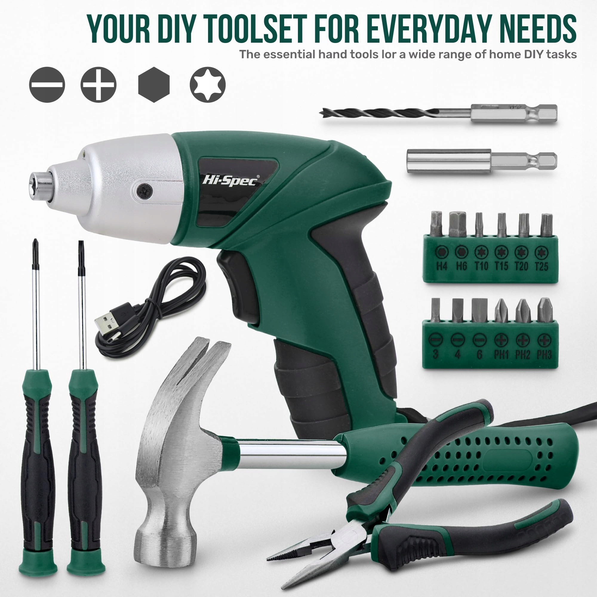 Hi-Spec 19-częściowy zielony zestaw narzędzi z USB 3.6V wkrętarka akumulatorowa. Mały zestaw narzędzi z elektrycznym wkrętakiem, zestawem bitów, młotkiem, szczypcami i innymi, wszystko w małej skrzynce narzędziowej