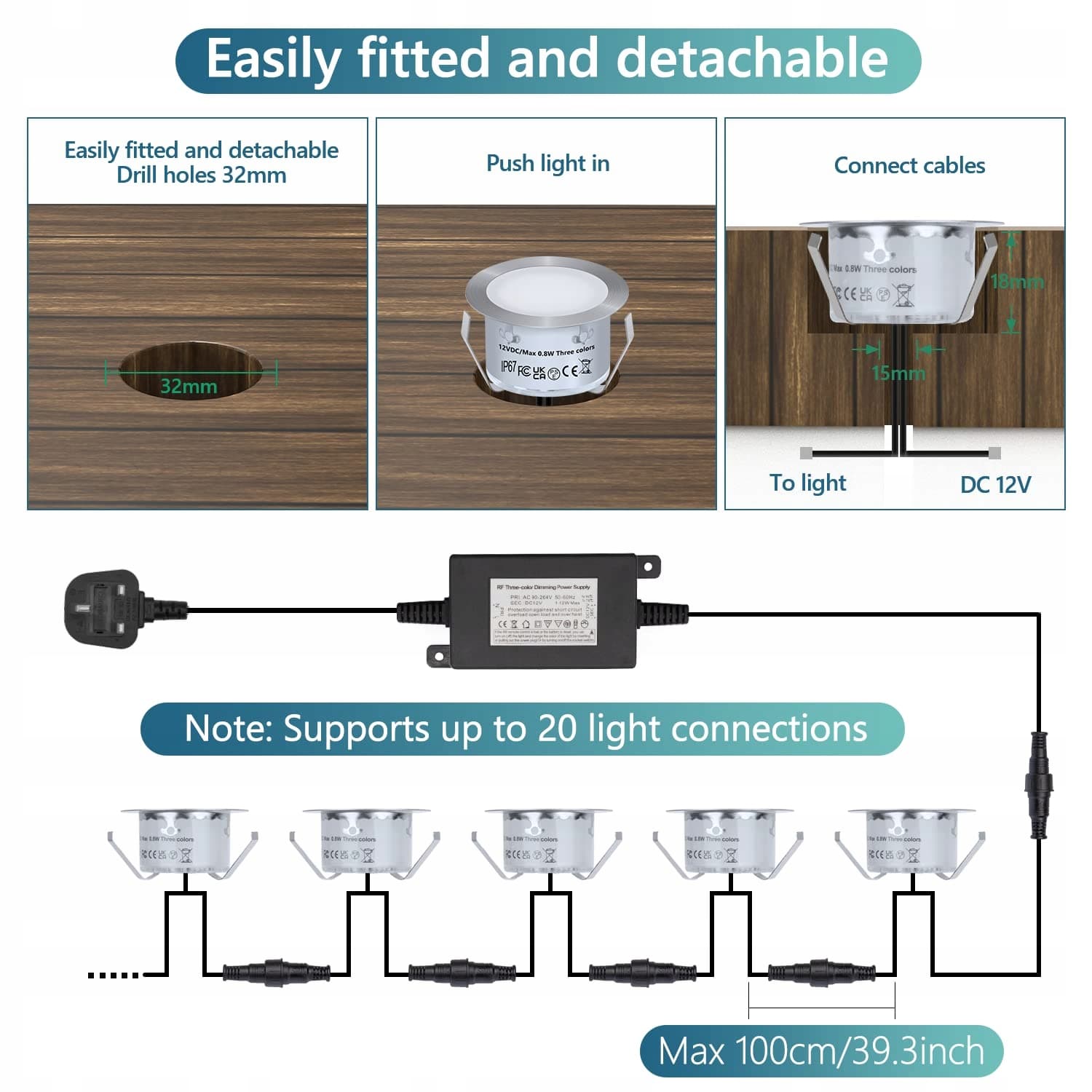 【Łatwe do zainstalowania i demontowalne】Wywierć otwory, wsadź oprawę wpuszczaną do podłogi i podłącz kable. Oświetlenie tarasowe można zamontować wszędzie tam, gdzie można wywiercić otwór. 10-częściowe lampy podszafkowe kuchenne są demontowalne i połączone równolegle, dzięki czemu możesz zainstalować tylko część z nich zgodnie z potrzebami. (Oprawa LED działa nadal bez zarzutu, nawet jeśli jedna lub dwie lampy sufitowe przestaną działać.)