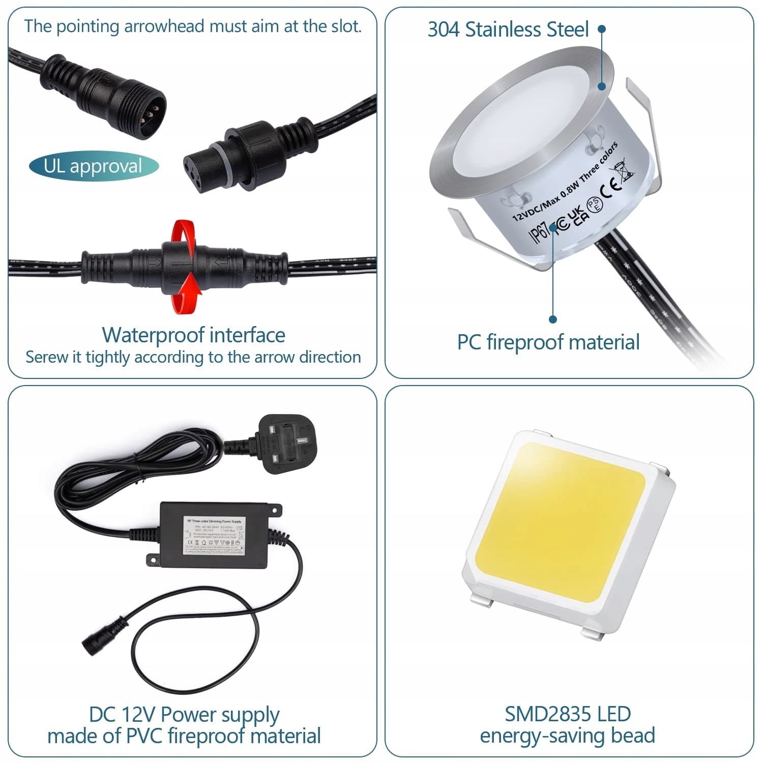 【Pyłoszczelne i wodoodporne IP67】Wykonane z wysokiej jakości akrylu/ABS i stali nierdzewnej 304, korpus lampy i zasilacz są całkowicie wypełnione klejem, całkowicie izolowane i wodoodporne zgodnie z klasą ochrony IP67. Można je montować na schodach tarasowych, stopniach tarasu, tarasach, podłogach, okapach, basenach, chodnikach, kuchniach, zewnętrznym oświetleniu krajobrazowym LED w ogrodzie, dekoracji wnętrz i na zewnątrz.