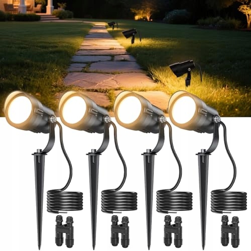 HIBOITEC 4 sztuki 12 W oświetlenie ogrodowe z łącznikiem przewodów, niskonapięciowy reflektor LED IP65 wodoodporny lampa ogrodowa, 2700 K ciepła biel reflektory ogrodowe na zewnątrz do ogrodu, trawnika, drzewa
