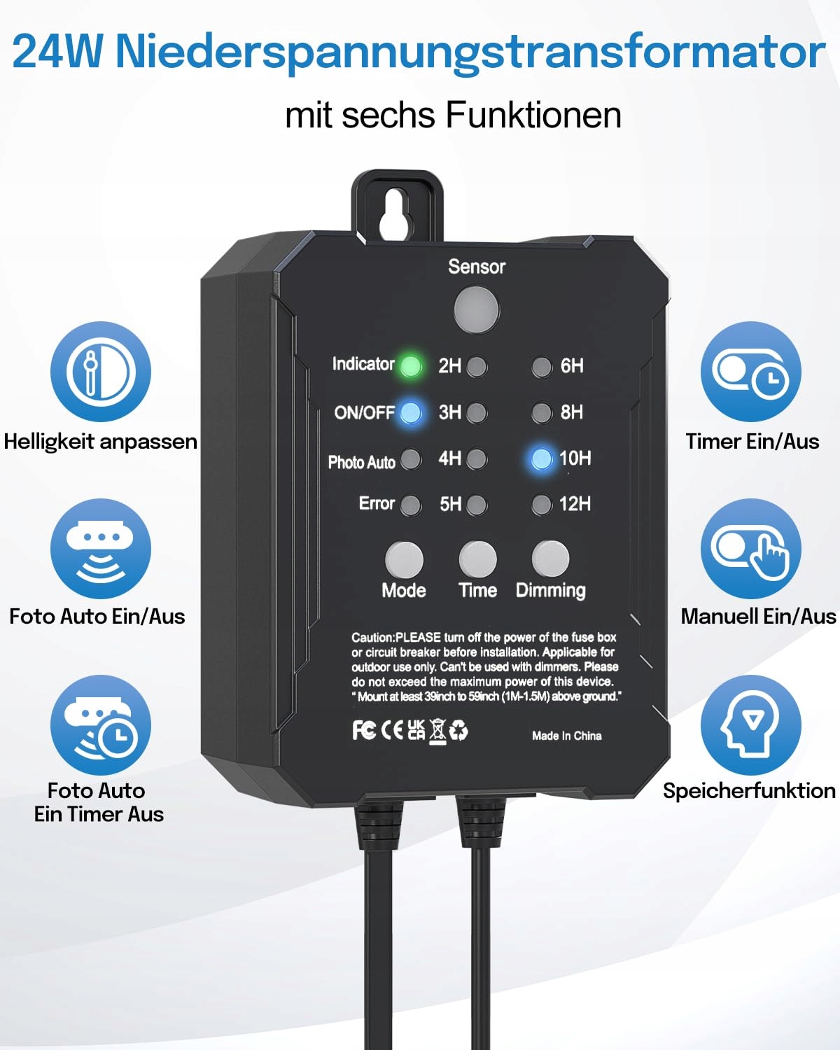 【Inteligentny transformator z czujnikiem zmierzchu】Wodoodporny transformator reflektora ogrodowego oferuje ręczną kontrolę + automatyczny timer/tryb zmierzchu. Oświetlenie ogrodowe włącza się po zmroku i pozostaje aktywne do wschodu słońca lub według indywidualnego programu. Nawet przy braku zasilania lampy ogrodowe zapamiętują ostatni tryb. Jednorazowa konfiguracja – trwała kontrola światła dla Twojego oświetlenia ogrodowego z zasilaniem.