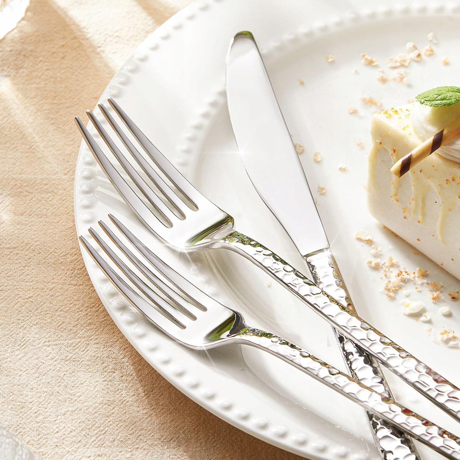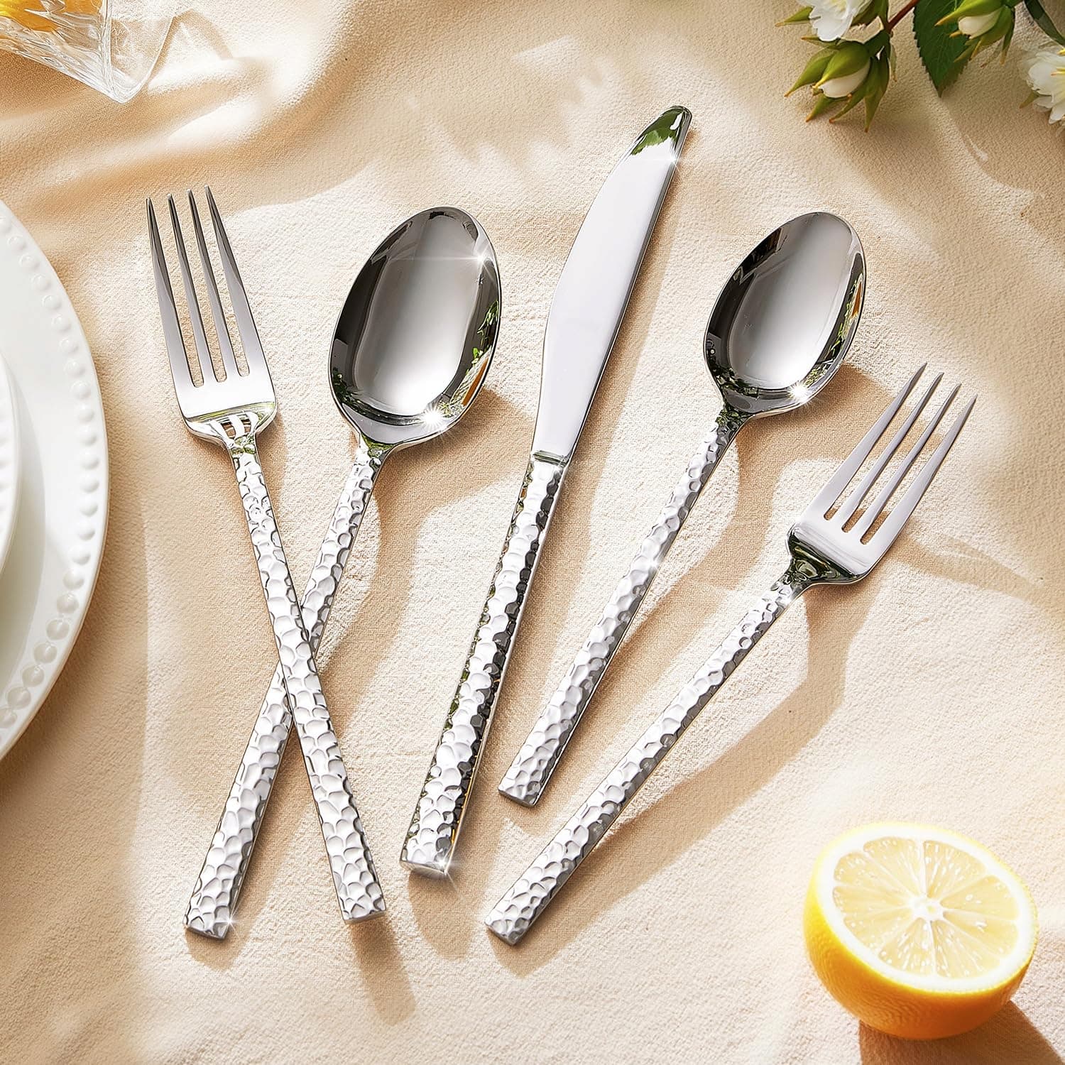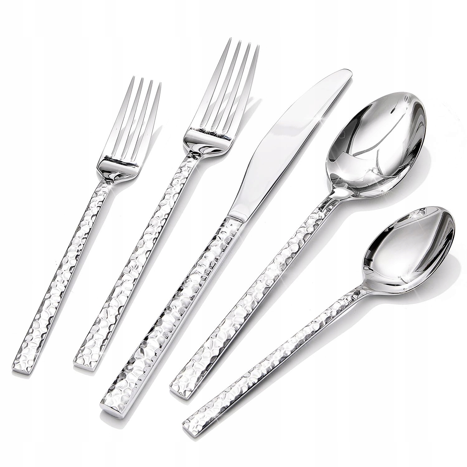 Zestaw sztućców HIKAA dla 6 osób, młotkowany, 30-częściowy zestaw sztućców 18/10, stal nierdzewna, zestaw sztućców do domu, na imprezy, wesela, zestaw sztućców polerowany na wysoki połysk, nadający się do mycia w zmywarce, (srebrny)