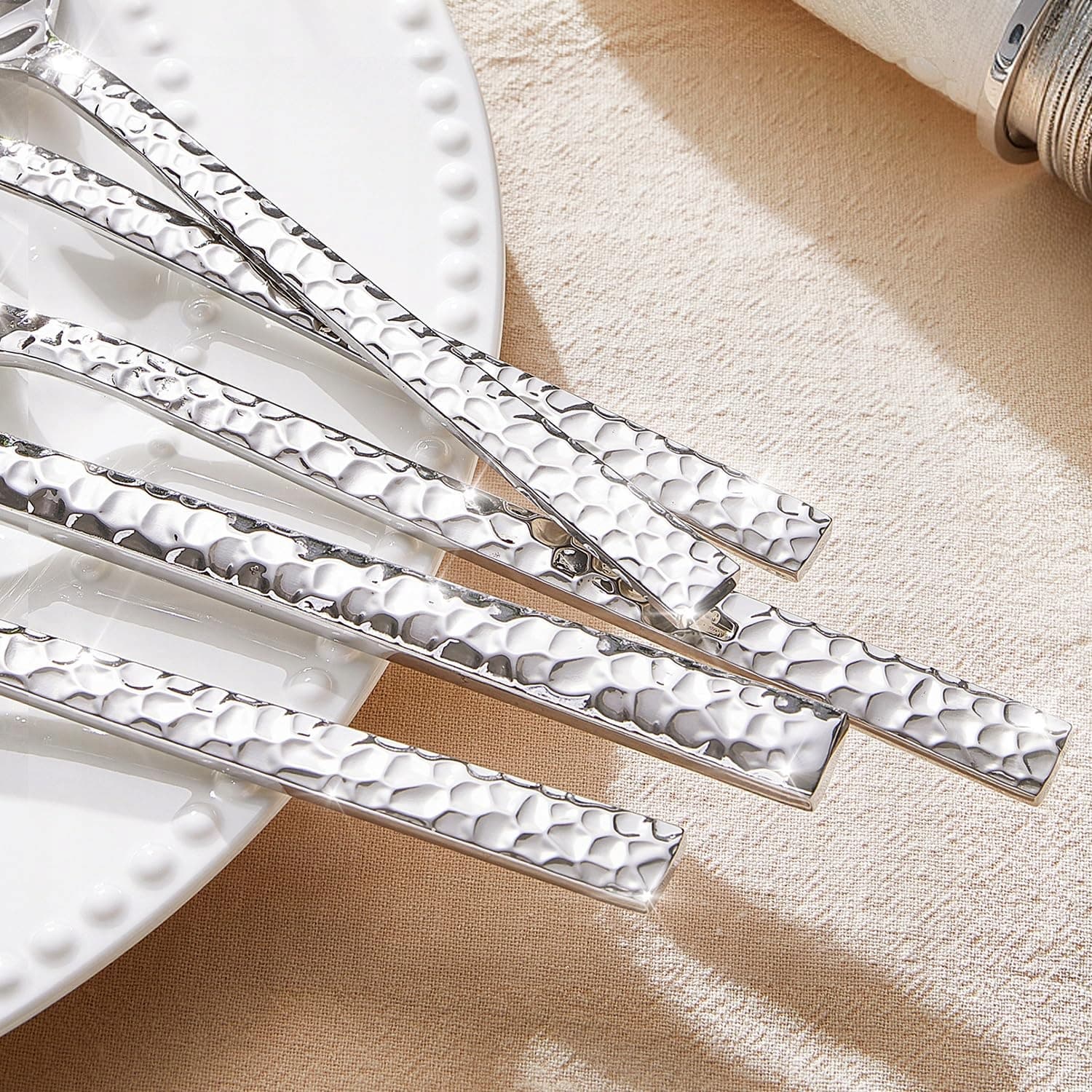 Elegancki młotkowany design: Młotkowana powierzchnia sztućców oraz trapezowe uchwyty zapewniają nie tylko wygodny chwyt, ale także emanują elegancją. Starannie polerowane, dodają każdej dekoracji stołu odrobinę luksusu.
