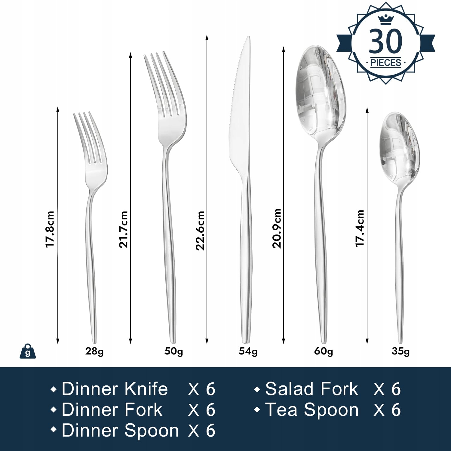 HIKAA Zestaw Sztućców 30 Sztuk Stal Nierdzewna Na 6 Osób Srebrny