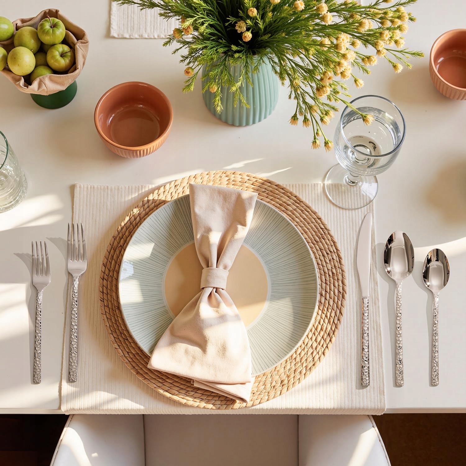 Elegancki młotkowany design: Młotkowana powierzchnia sztućców i trapezowe uchwyty nie tylko zapewniają wygodny chwyt, ale także emanują elegancją. Starannie polerowane, dodają każdej dekoracji stołu odrobinę luksusu.