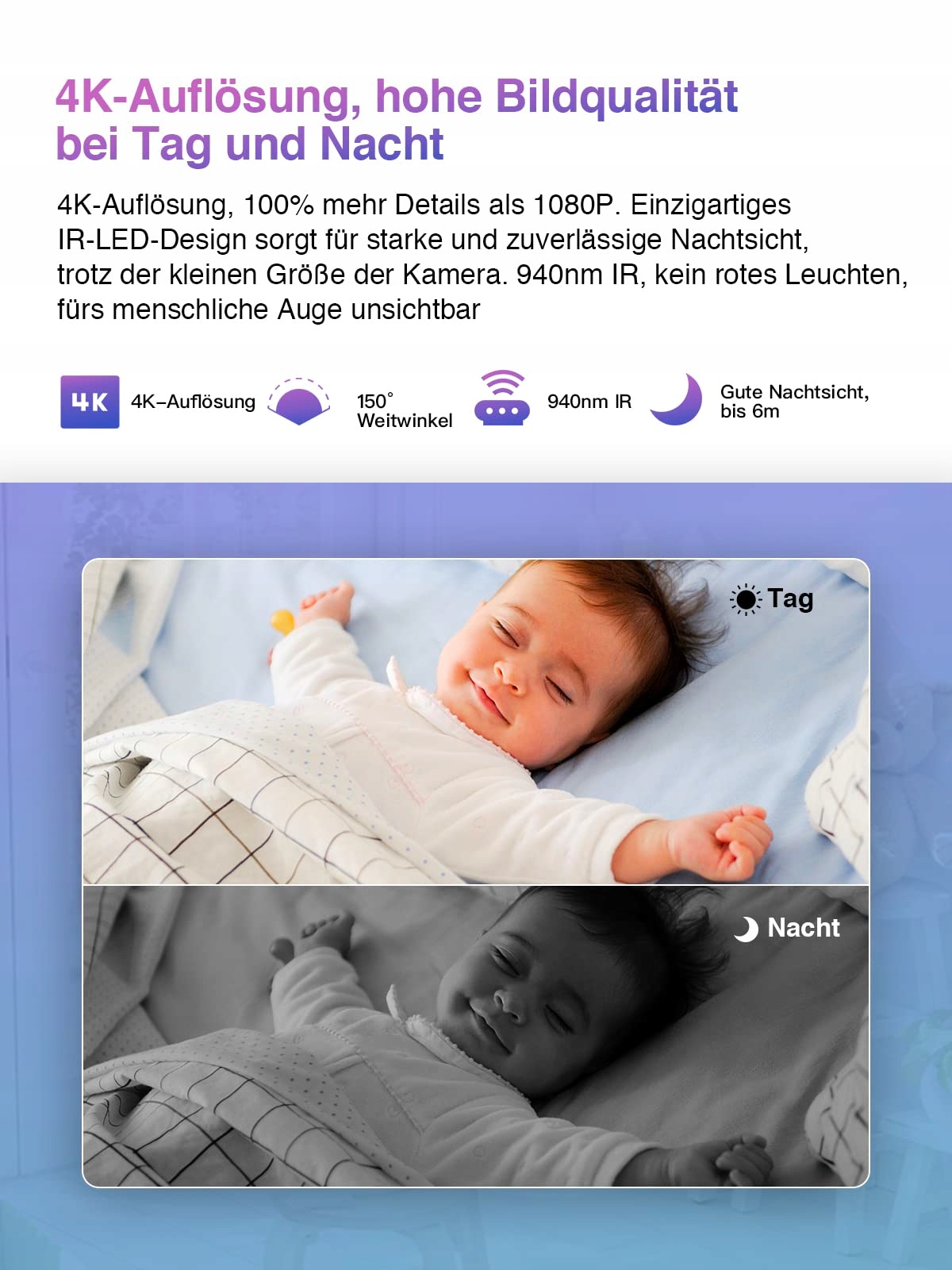 [4K Ultra-HD, nocna wizja] Mini kamera oferuje wideo Ultra-HD 2K 15fps i zdjęcia w 4K Ultra-HD. Jej wysokiej jakości obiektyw 8 MP zapewnia bardzo dobrą jakość wideo i kąt widzenia 150°. Wyposażona w 6 diod LED IR 940nm, oferuje nocną wizję do 6m. Diody IR są niewidoczne dla ludzkiego oka, nie ma widocznego czerwonego światła. Możesz oglądać wideo na żywo na smartfonie, z domu lub w drodze.