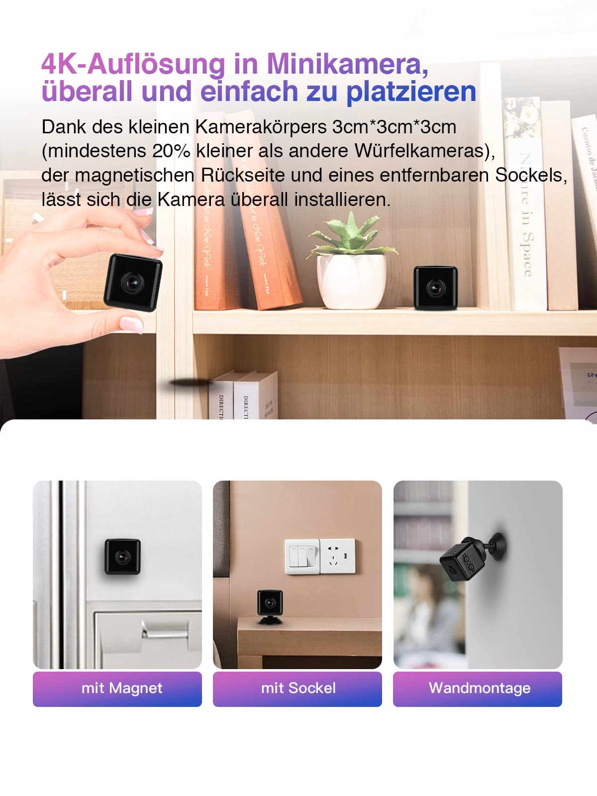 [Mini format, łatwa w użyciu i instalacji] Mały format, 3cm * 3cm * 3cm (co najmniej 20% mniejsza niż inne kamery sześcienne) Łatwa do umieszczenia, gdzie tylko chcesz. Ustawienie to bułka z masłem – wystarczy zeskanować kod QR na smartfonie, a potem zaczynać. Nie jest wymagane żadne techniczne przygotowanie.