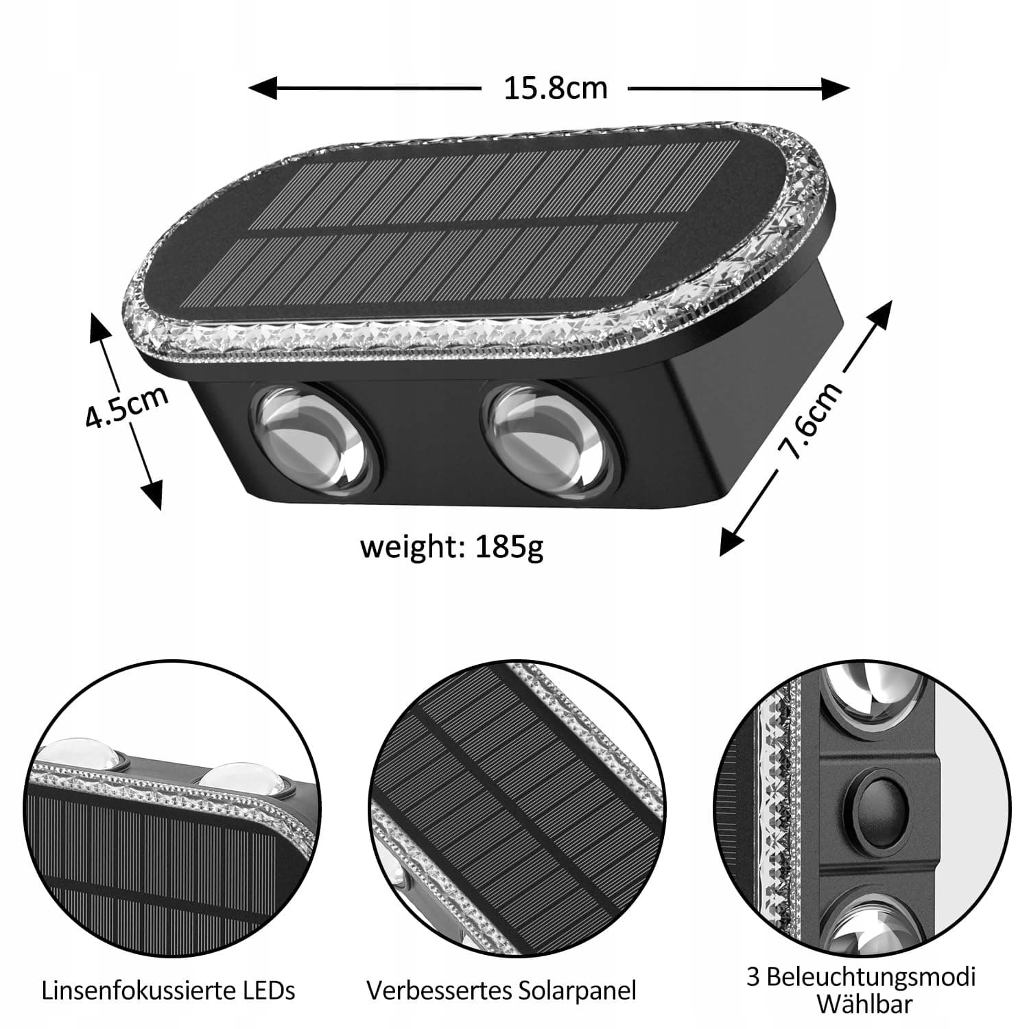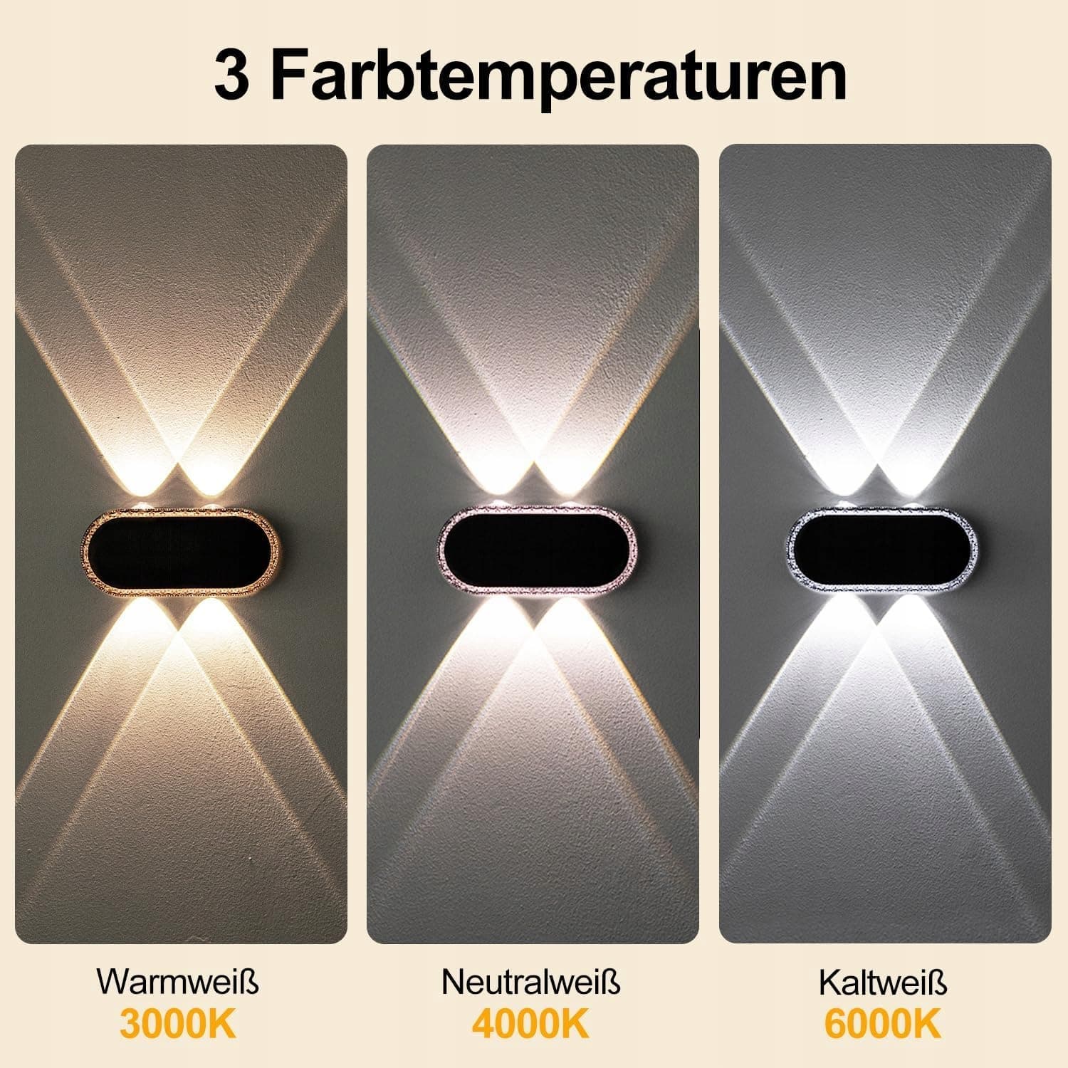 4 diody LED dla jaśniejszego, szerszego światła: Te lampy solarne na zewnątrz na ścianę z oświetleniem góra i dół oraz po dwie diody LED na każdą stronę zapewniają równomierne, szerokie oświetlenie – znacznie skuteczniejsze niż pojedyncze lampy, dzięki czemu na tę samą ścianę potrzeba mniej lamp. Wybierz między 3000K/4000K/6000K i stwórz odpowiedni nastrój świetlny na zewnątrz