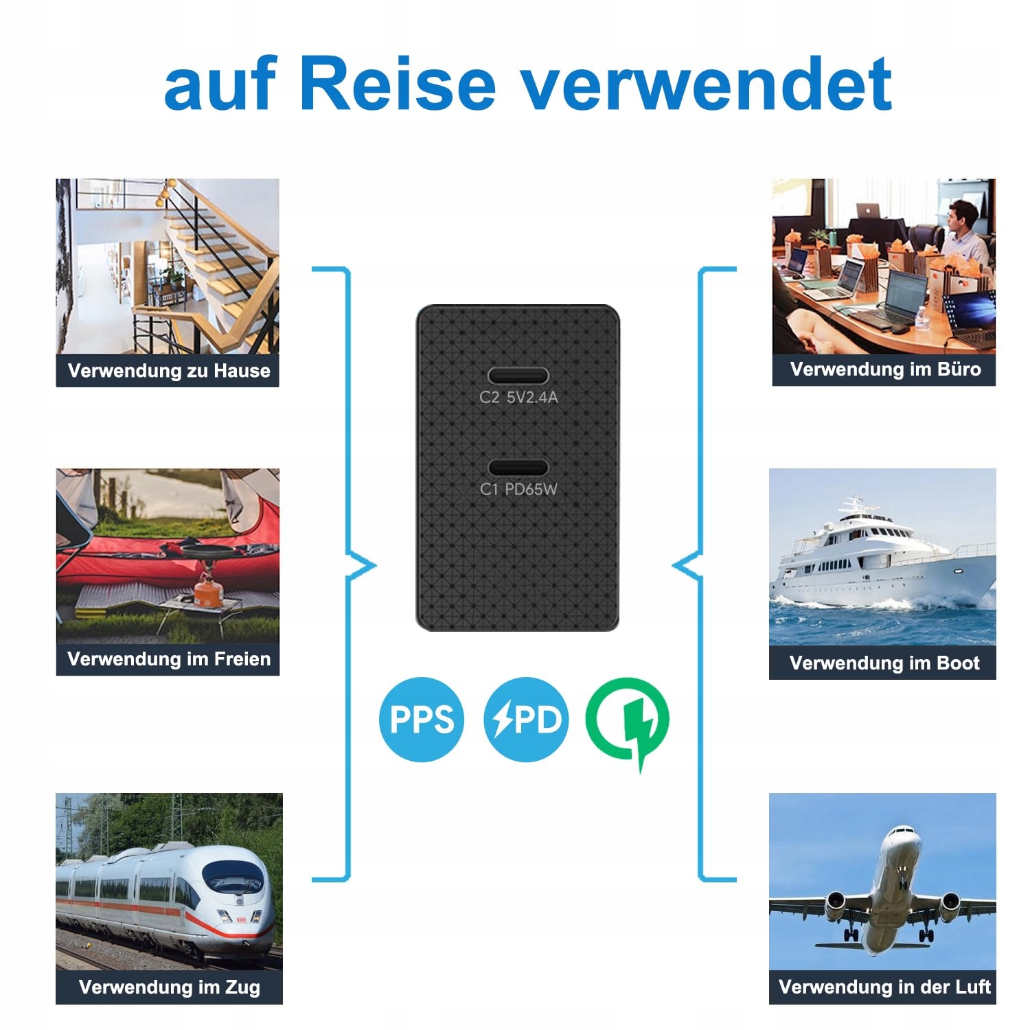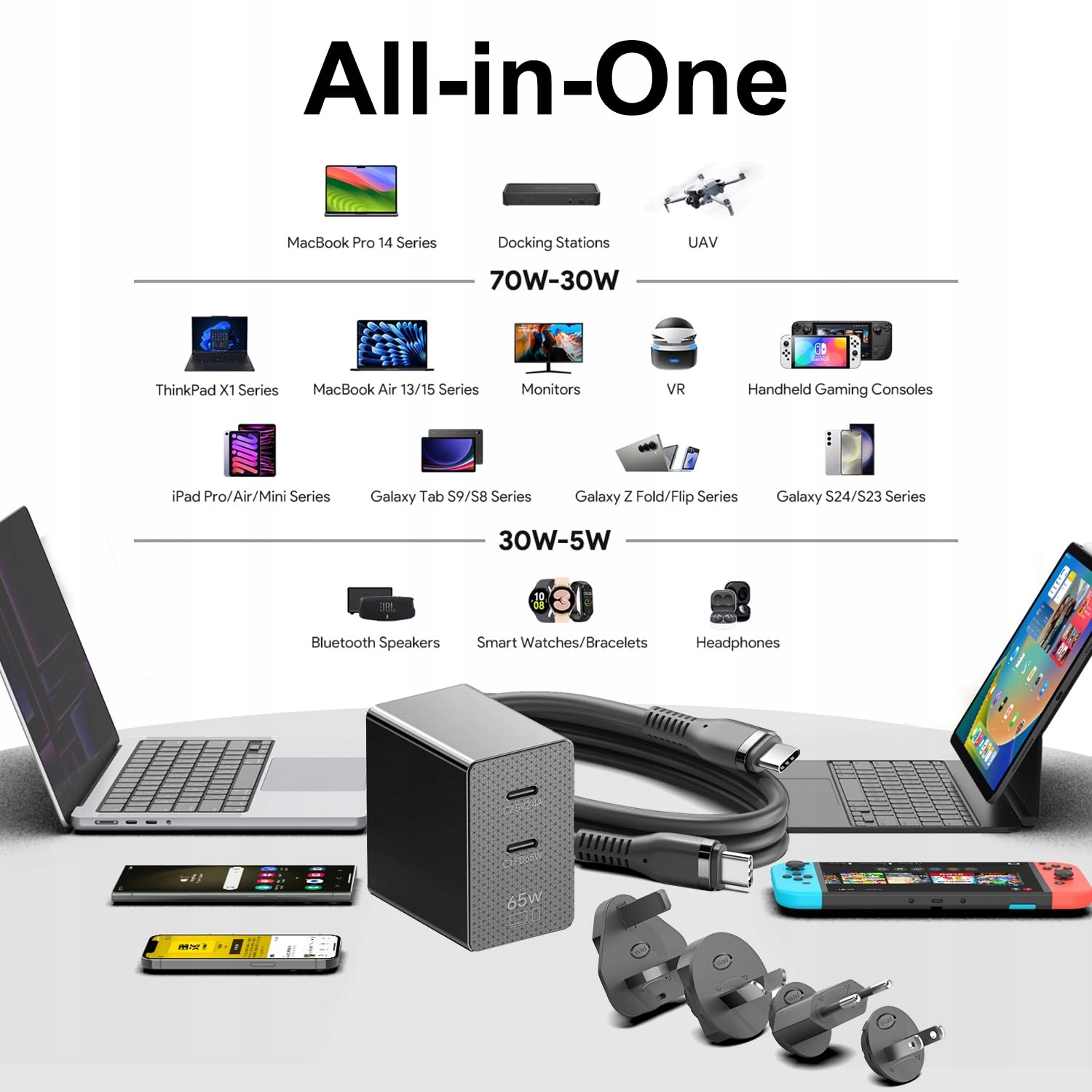 Napięcie wejściowe: 100-240 V, USB-C1 wyjście: 5V/9V/12V/15V--3A 20V3.25A 65.0W MAX. Podwójny port. USB-C2 wyjście: 5V2.4A 12.0W. MAX. Kompaktowa forma, 4 x adaptery wtyczki o różnych specyfikacjach, długość kabla USB C 1,5 metra, chip Cypress PD3.0, wydajne i stabilne napięcie, ładuj swoje urządzenia w dowolnym miejscu i czasie.