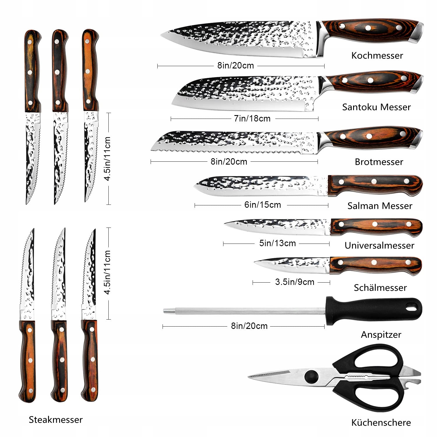 ★Uniwersalny zestaw noży na wszystkie Twoje potrzeby★ 15-częściowy zestaw bloków nożowych zawiera: 1x nóż szefa kuchni, 1x nóż Santoku, 1x nóż do chleba, 1x nóż do łososia, 1x nóż uniwersalny, 1x nóż do obierania, 6x noży do steków, 1x ostrzałkę, 1x nożyczki kuchenne, 1x blok na noże. Dla profesjonalnych kucharzy i gospodyń domowych ten blok z nożami jest niezbędny.