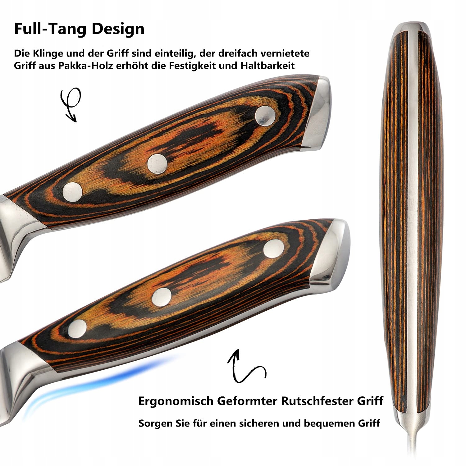 ★Rączka nitowana z drewnianym usłojeniem★ Cały nóż wykonany jest z jednego kawałka stali, z zewnętrzną warstwą drewna Pakkawood i trzema nitami dla zwiększenia trwałości. Ergonomiczna, antypoślizgowa rączka z drewnianym usłojeniem zapewnia wygodny chwyt, optymalną wagę i równowagę oraz minimalizuje zmęczenie palców.