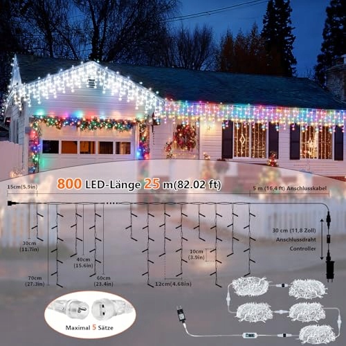 Holwim 800LED Girlanda świetlna z efektem lodowego deszczu, rozszerzalna o 25+5M, kurtyna świetlna na Boże Narodzenie z wodoodpornością IP65, 8 trybów, wtyczka, timer, funkcja pamięci do użytku wewnątrz i na zewnątrz, dekoracja na Boże Narodzenie, dach, balkon