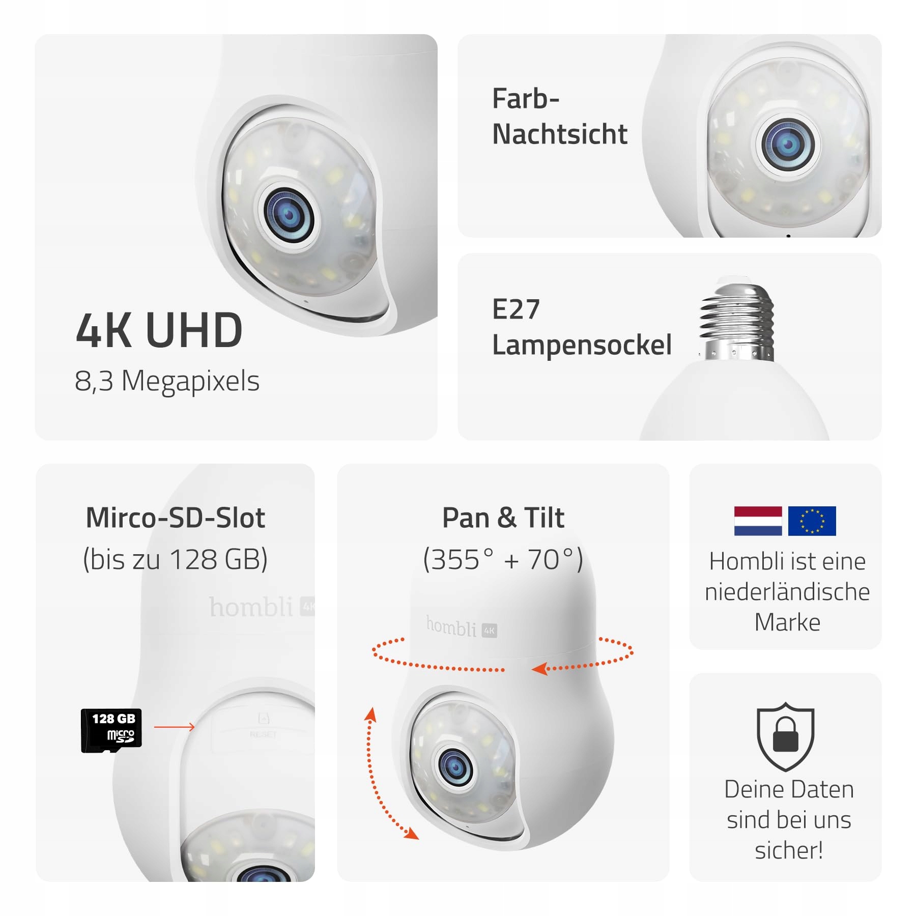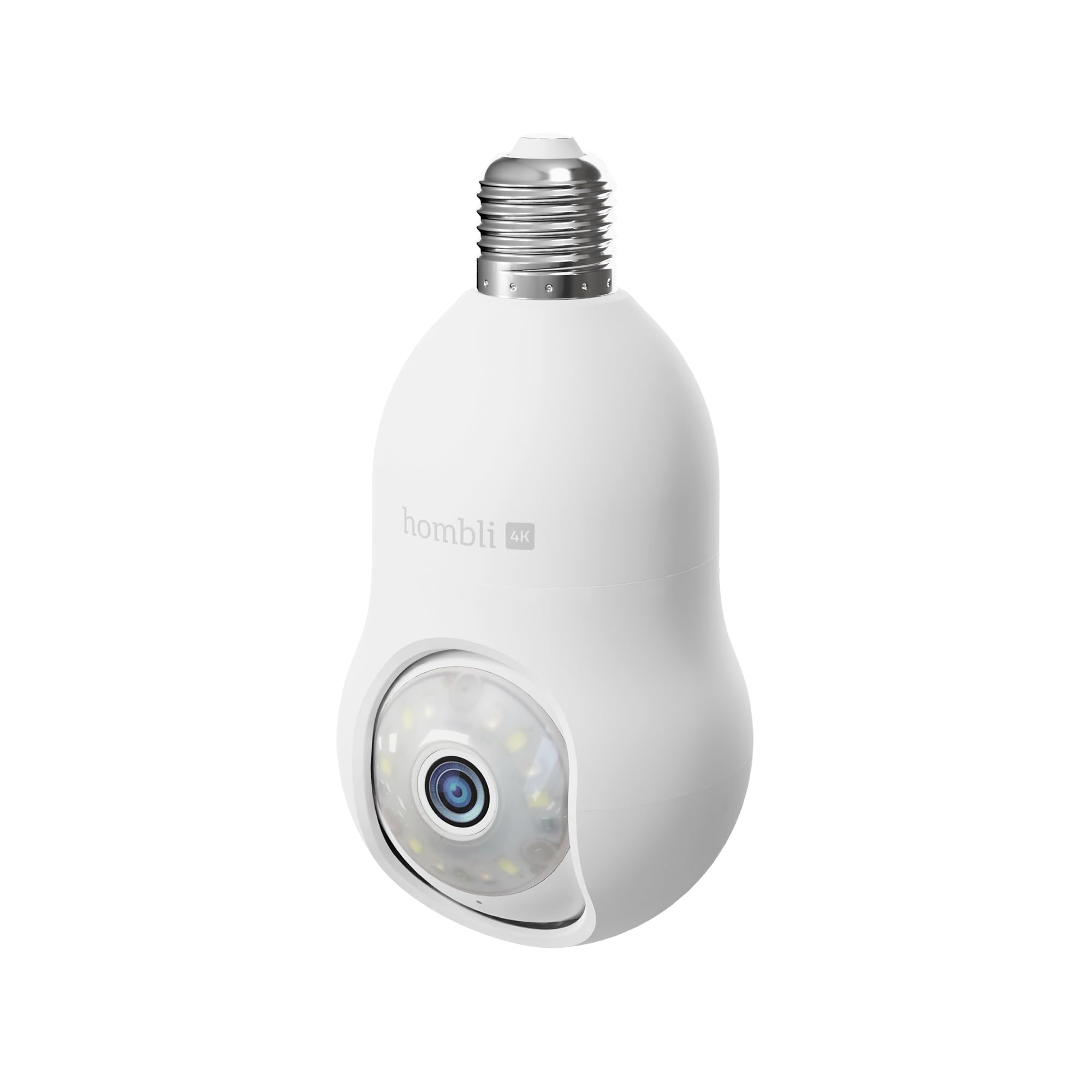 Hombli Bulb Cam z rozdzielczością 4K UHD, kolorowym trybem nocnym, podczerwienią, śledzeniem ruchu, alarmem, dźwiękiem, kompatybilna z Alexa i Google, gwint E27