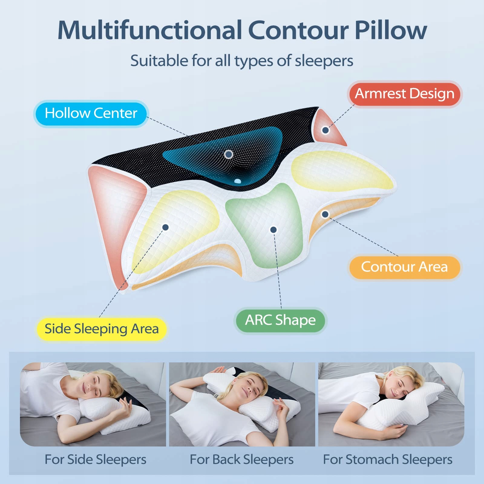 💤[Idealna poduszka do spania na plecach]Kiedy śpisz na plecach, naturalne podparcie szyi i głowy może zmniejszyć nacisk na tylną część czaszki, zmniejszyć chrapanie i poprawić jakość snu. Kiedy śpisz na boku, wycięcie pod poduszką odpowiada krzywej twojego barku, co pozwala na odciążenie barku i ułożenie ramienia w dłoni, aby zmniejszyć drętwienie.