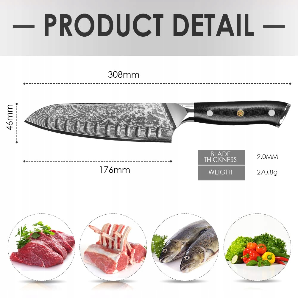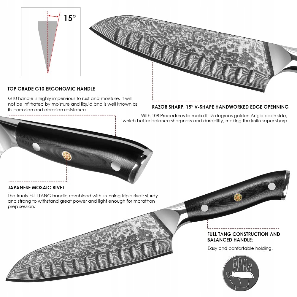 ▶Profesjonalny nóż Santoku z damasceńskiej stali◀ Nóż kuchenny Home Safety wykorzystuje wysokiej jakości 67-warstwową stal damasceńską i jest poddawany obróbce cieplnej w próżni oraz chłodzeniu ciekłym azotem. Ostrze ma kąt 15 stopni, co jest przydatne dla dobrej grubości krawędzi przy jednoczesnym zachowaniu doskonałej ostrości.
