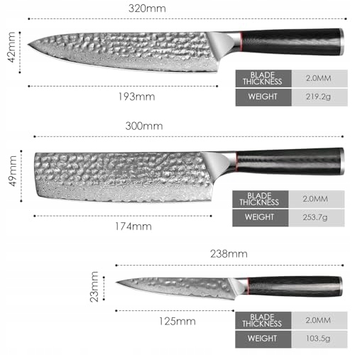 【Profesjonalny zestaw noży】Profesjonalne noże kuchenne ze stali damasceńskiej mogą spełniać różne zadania krojenia w kuchni. Zestaw obejmuje nóż kuchenny 8-calowy, nóż Nakiri 7-calowy i nóż uniwersalny 5-calowy. Nadaje się do siekania, krojenia, cięcia i kostkowania owoców, ryb, mięsa, sushi, ziół i warzyw.