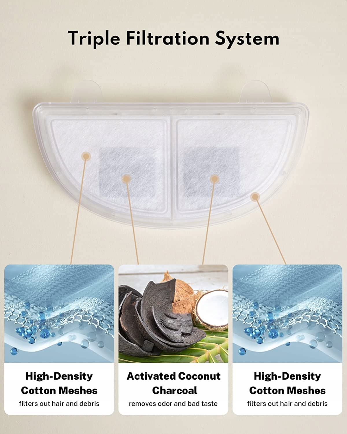 Potrójna filtracja: Filtr składa się z aktywnego węgla kokosowego, który jest osadzony między dwiema warstwami tkaniny bawełnianej. Może usuwać niewidoczne cząstki, takie jak włosy, metale ciężkie i pozostałości chloru z wody pitnej, chroniąc w ten sposób zdrowie wody pitnej zwierząt domowych i zmniejszając ryzyko infekcji dróg moczowych.